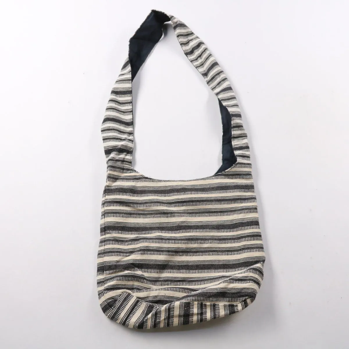 Текстильная сумка через плечо без указания бренда, в черно-белую полоску, с длинным мягким ремнём. Подойдёт для прогулок и повседневных дел, есть молния на кармане. Лёгкая и компактно складывается.