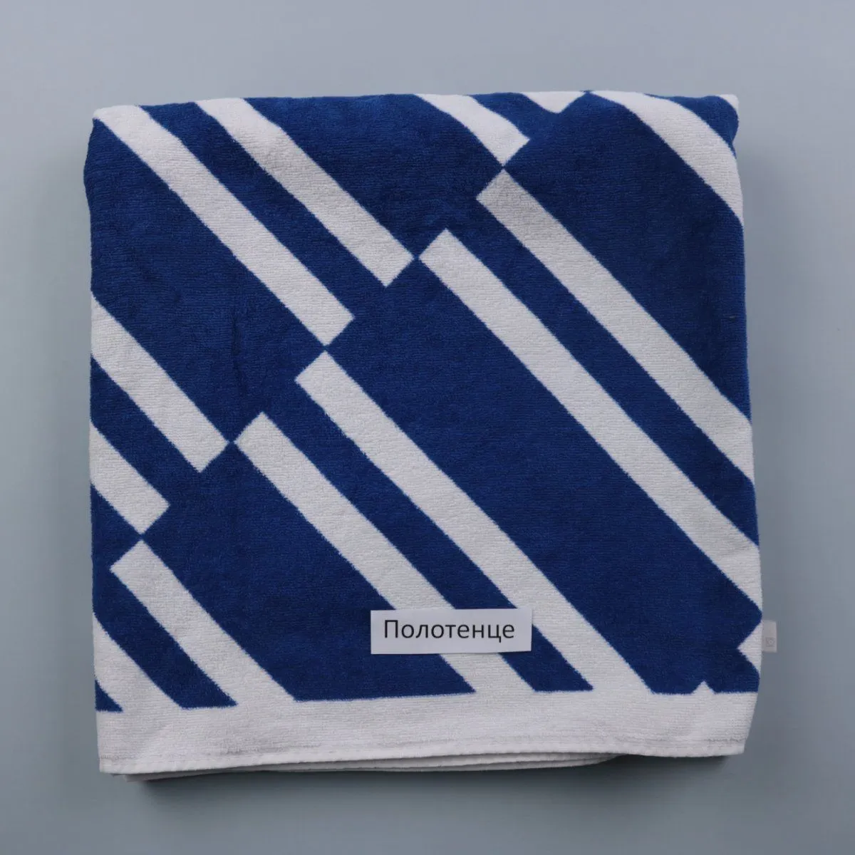 Полотенце из 100% хлопка с сине-белым геометрическим рисунком. Подойдёт для ванной, бассейна или пляжа, хорошо впитывает влагу и быстро сохнет.