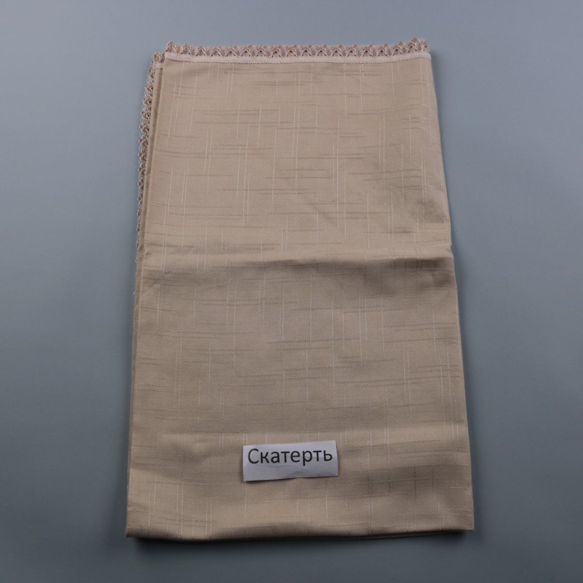 Скатерть бежевого цвета с фактурным рисунком и кружевной окантовкой по краю. Подойдёт для сервировки кухонного или праздничного стола, добавляет аккуратный завершённый вид. Легко складывается и удобно хранится, защищая поверхность стола от загрязнений.