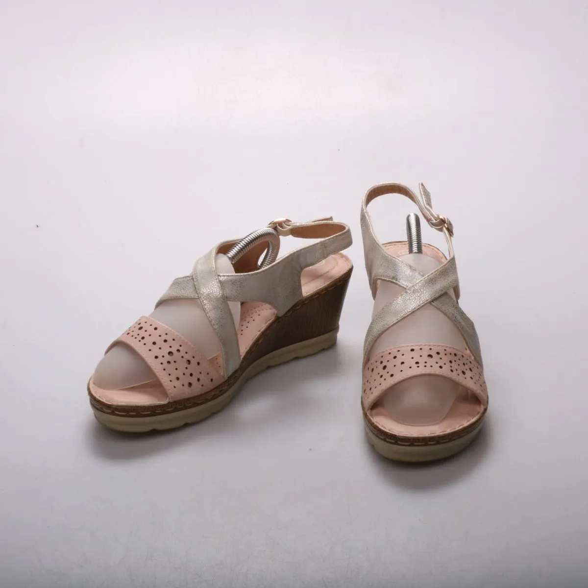 Женские босоножки Ladyflex на устойчивой танкетке с открытым носком и ремешком на пятке с пряжкой. Верх выполнен в комбинированных оттенках (пудровый и серебристый) с перфорацией на переднем ремешке, подойдут для летних прогулок и повседневных образов. Танкетка добавляет рост и при этом распределяет нагрузку более равномерно, чем шпилька.