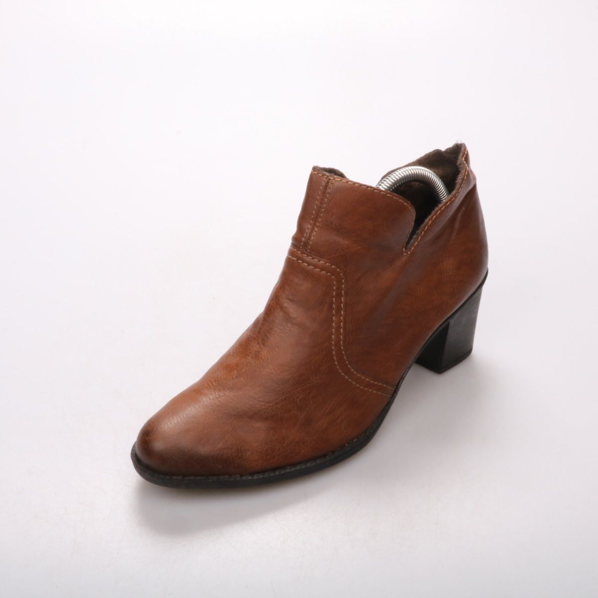 Женские ботильоны Rieker из коричневой кожи, с удобной боковой молнией и устойчивым каблуком. Подойдут на каждый день в межсезонье, хорошо сочетаются с джинсами и платьями. Практичная подошва с протектором меньше скользит и удобна для прогулок.