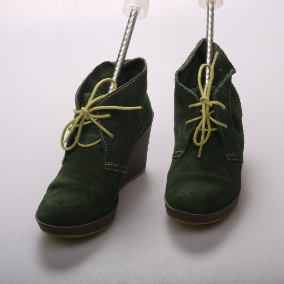 Ботильоны из зелёной замши на танкетке, со шнуровкой и аккуратной посадкой по щиколотке. Подойдут для повседневных образов в межсезонье и в офис. Устойчивая танкетка даёт подъём и при этом удобнее в ходьбе, чем шпилька.