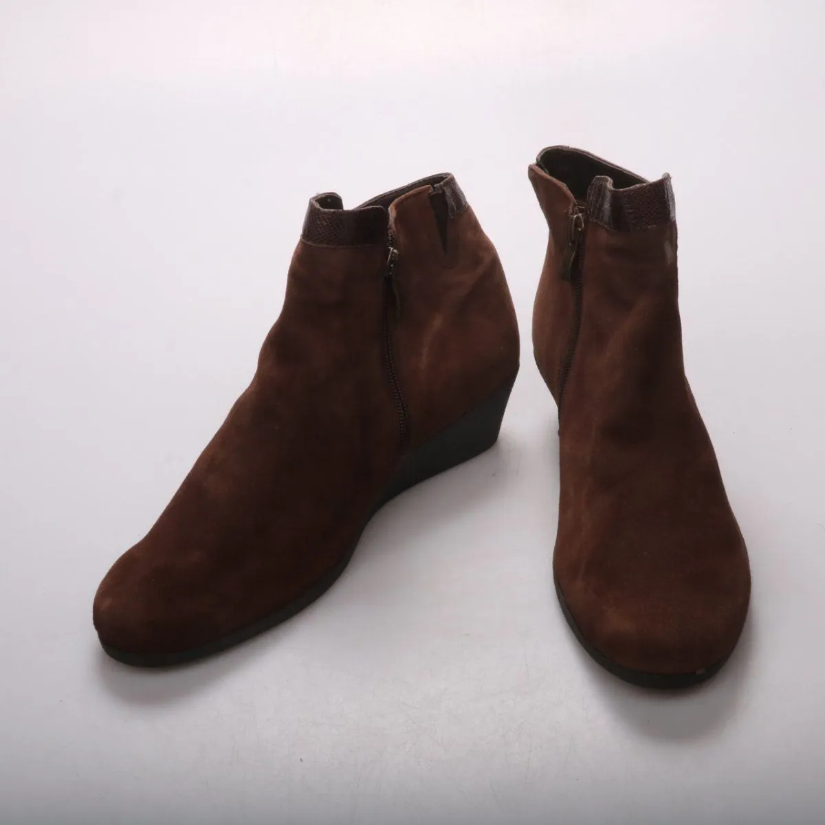 Женские ботильоны Caprice из коричневой замши на устойчивой танкетке, с боковой молнией. Подойдут для повседневной носки в межсезонье и легко сочетаются с джинсами и платьями. Танкетка даёт более уверенную опору и комфорт при ходьбе.