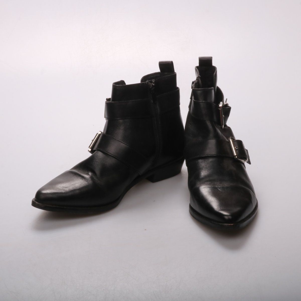 Женские ботильоны Bronx из чёрного гладкого материала с двумя ремешками и металлическими пряжками, сбоку застёжка-молния. Подойдут для повседневных образов в межсезонье и прохладную погоду. Устойчивый невысокий каблук делает их удобными для ходьбы.