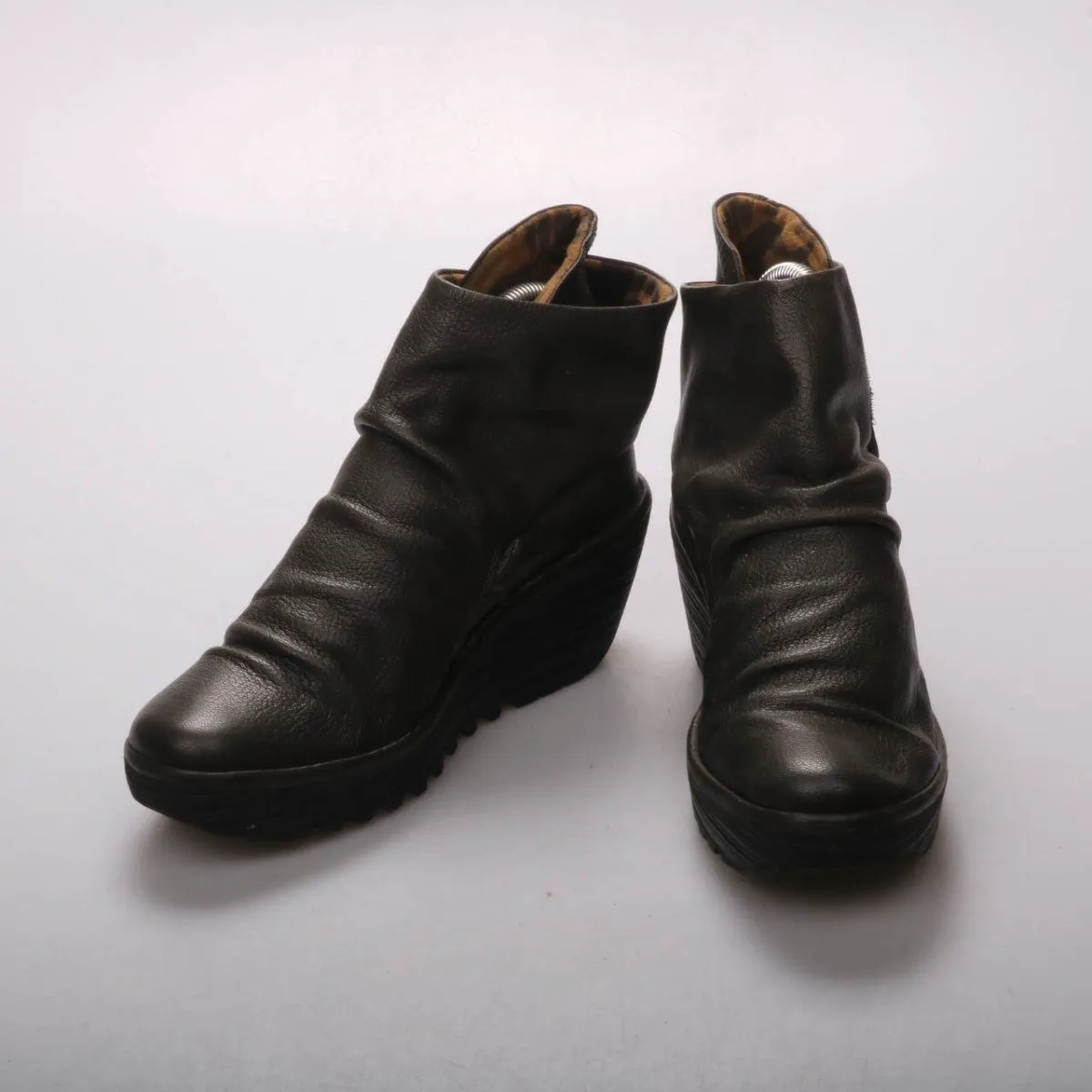 Женские кожаные ботильоны Fly London чёрного цвета на устойчивой танкетке, с мягким голенищем и складками на подъёме. Подойдут на каждый день в межсезонье и для прогулок по городу. Рельефная подошва даёт более уверенное сцепление с поверхностью.