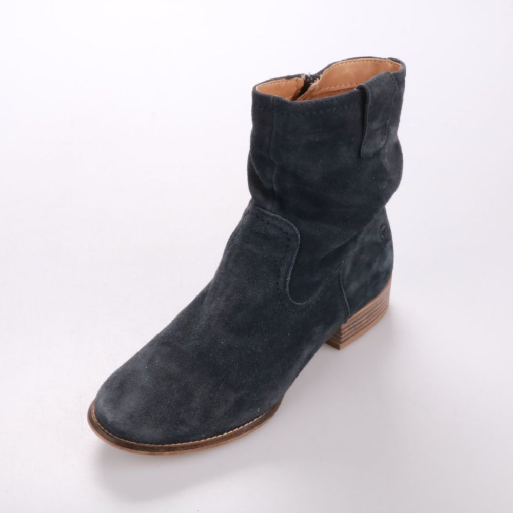 Женские замшевые ботинки Tamaris в тёмно-синем цвете на устойчивом невысоком каблуке. Подойдут для повседневных образов на осень и весну, хорошо сочетаются с джинсами и платьями. Удобно надевать благодаря боковой молнии.