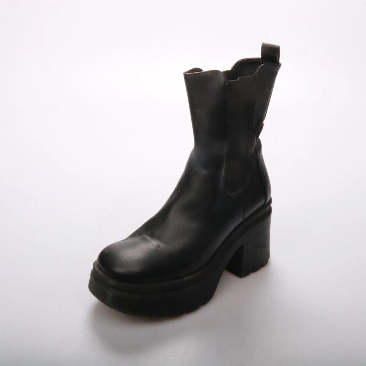 Женские чёрные ботинки без указанного бренда на массивной платформе и устойчивом каблуке, с эластичными вставками по бокам. Подойдут для повседневных городских образов в демисезон и прохладную погоду. Рельефная подошва даёт хорошее сцепление и комфорт при ходьбе.