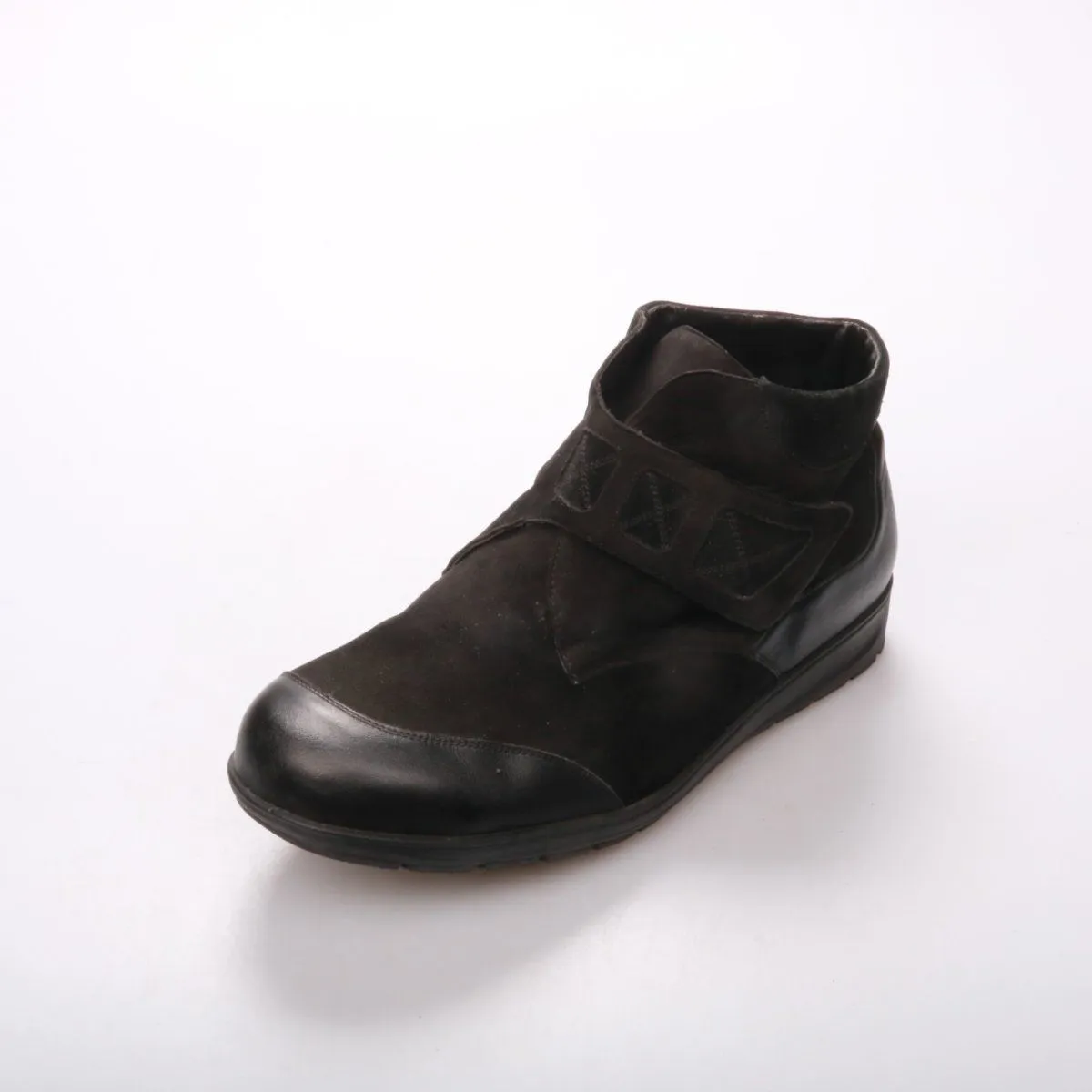 Мужские ботинки Waldlaufer в чёрном цвете из сочетания натуральной кожи и замши, с застёжкой на липучке. Подойдут для повседневной носки в демисезон, хорошо смотрятся с джинсами и брюками. Практичная рифлёная подошва даёт устойчивость на мокром асфальте.