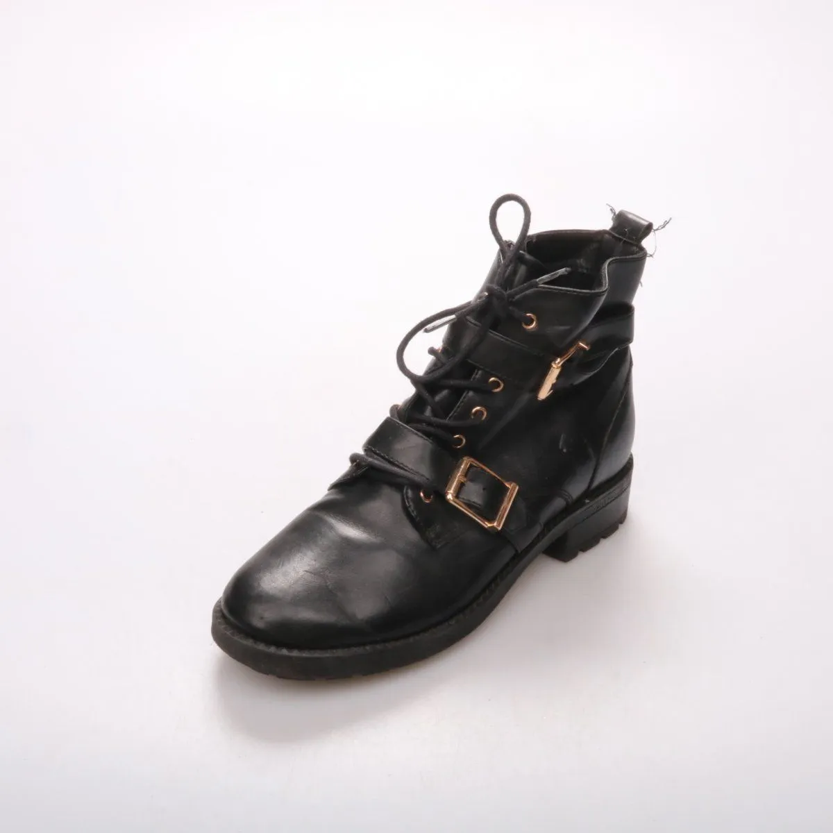 Женские черные ботинки на шнуровке с боковой молнией и ремешком с пряжкой, бренд не указан. Подойдут для повседневных образов в межсезонье, хорошо сочетаются с джинсами и платьями. Плотная подошва с протектором дает более уверенное сцепление на мокром асфальте.