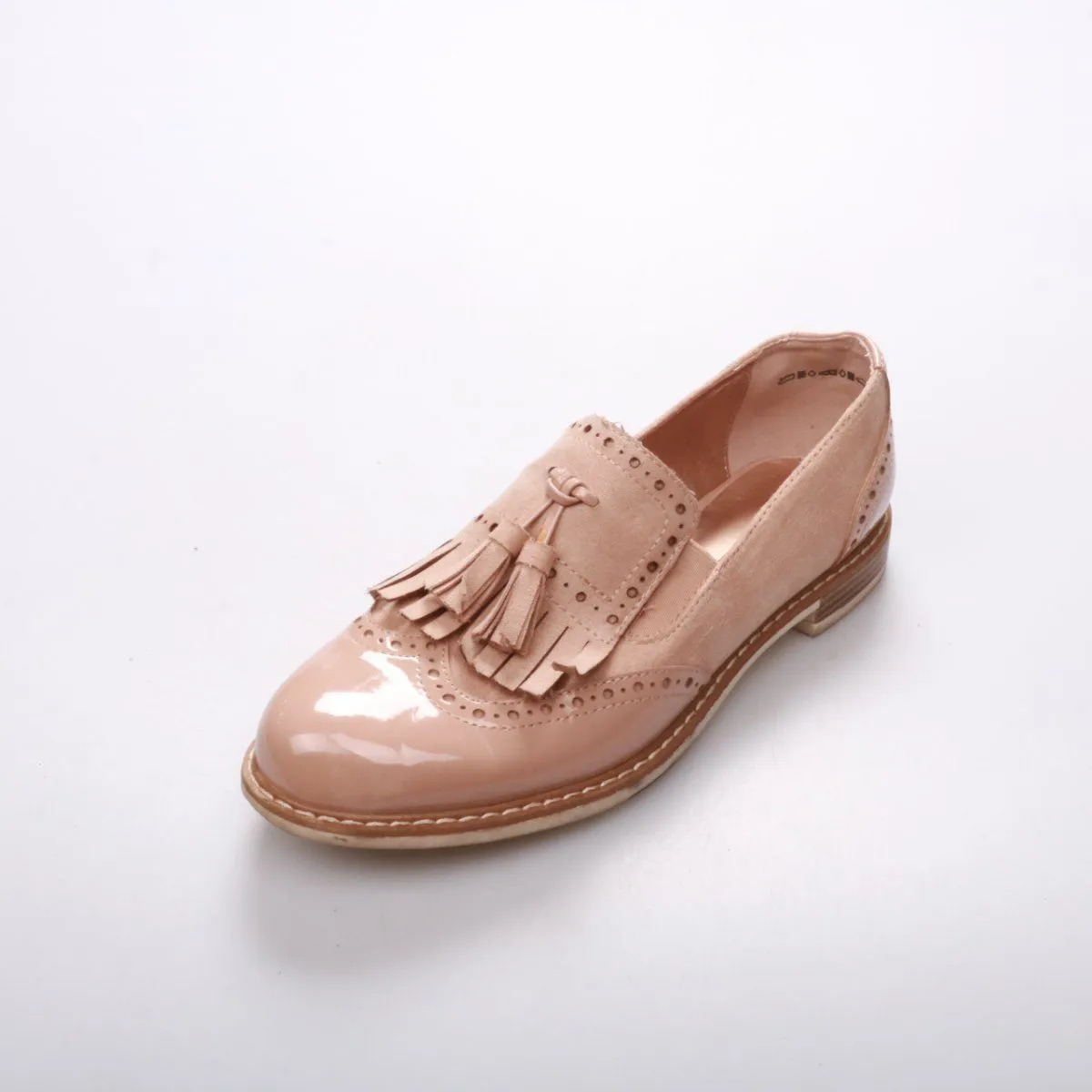 Женские лоферы Graceland в нюдовом бежево-розовом цвете, лаковые с декоративной перфорацией и кисточками. Подойдут для офиса и повседневных образов с брюками или юбками в тёплый сезон. Невысокий устойчивый каблук и рифлёная подошва делают ходьбу комфортнее.