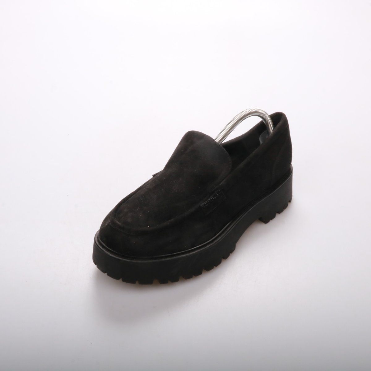 Черные лоферы на массивной рифленой подошве, верх выглядит как мягкая замша. Подойдут для повседневных образов в городе в демисезон. Практичный плюс — толстая тракторная подошва дает хорошее сцепление и устойчивость.