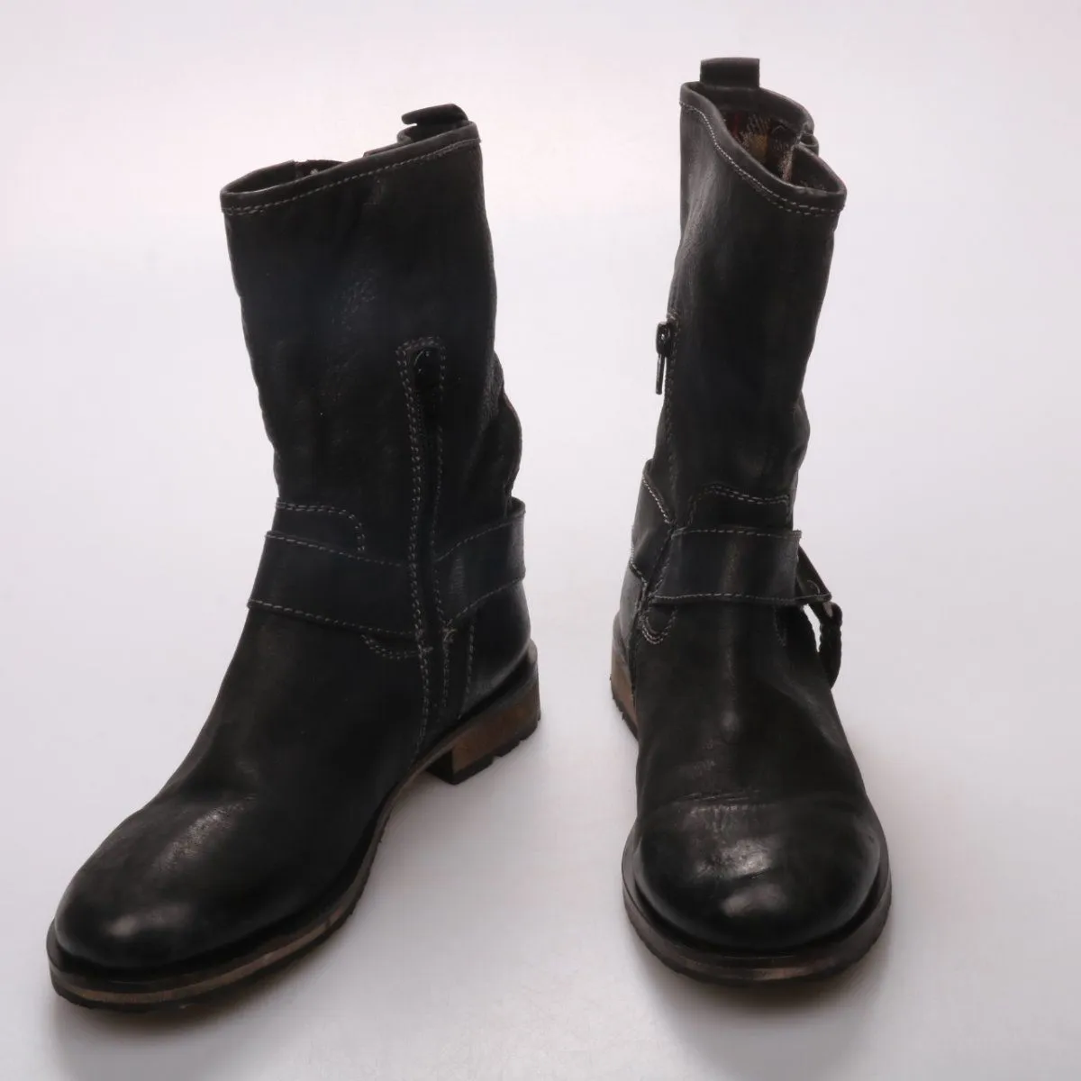 Женские полусапоги Belmondo из чёрной кожи с ремешком и пряжкой в байкерском стиле. Подойдут для повседневной носки в прохладную погоду осенью и весной, хорошо сочетаются с джинсами и платьями. Удобная молния сбоку и рифлёная подошва дают хорошую фиксацию и сцепление.