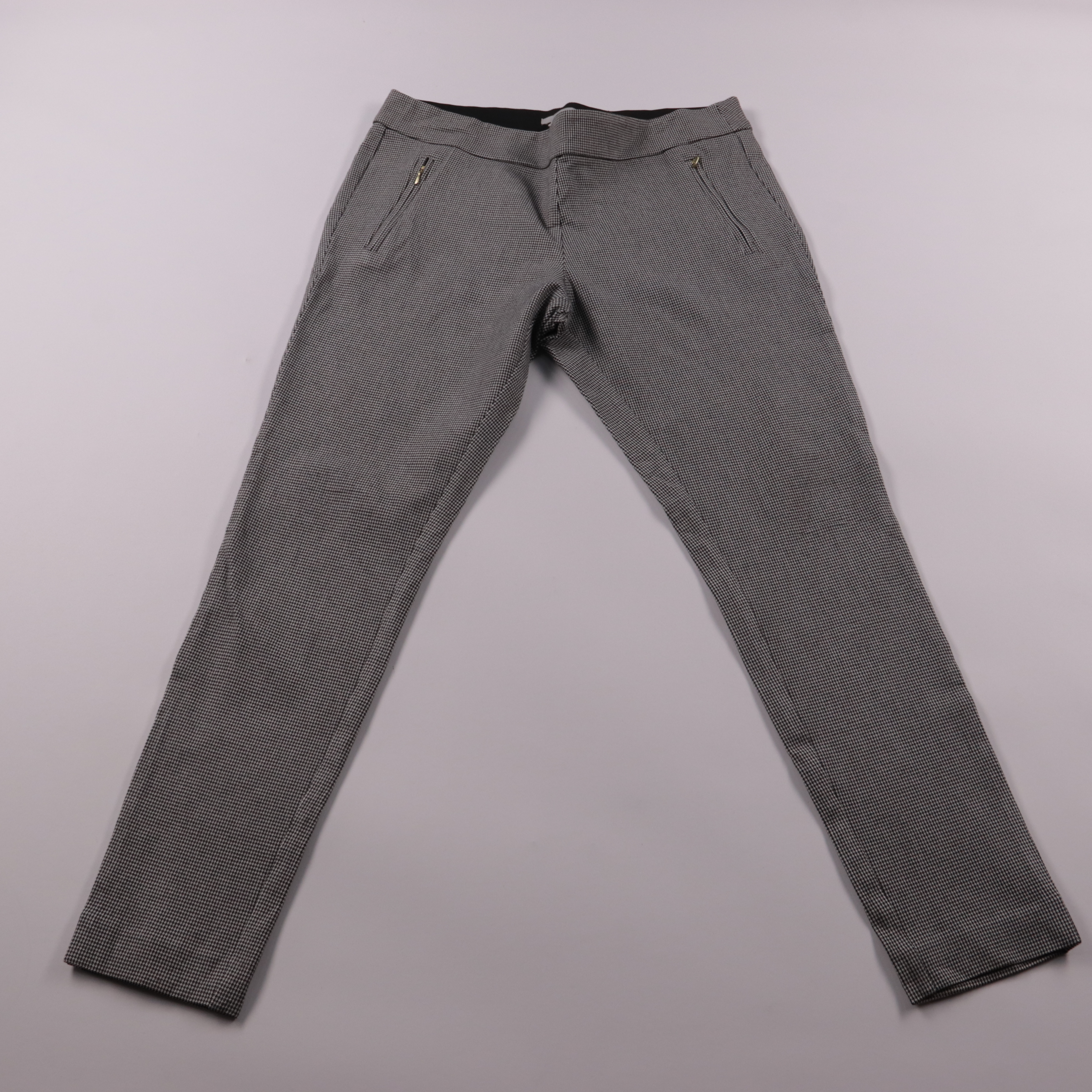 Брюки H&M в мелкую чёрно-белую клетку, зауженные, с карманами на молнии. Подойдут для офиса и повседневных образов с рубашкой или свитером. Материал с эластаном хорошо тянется и комфортно сидит по фигуре.