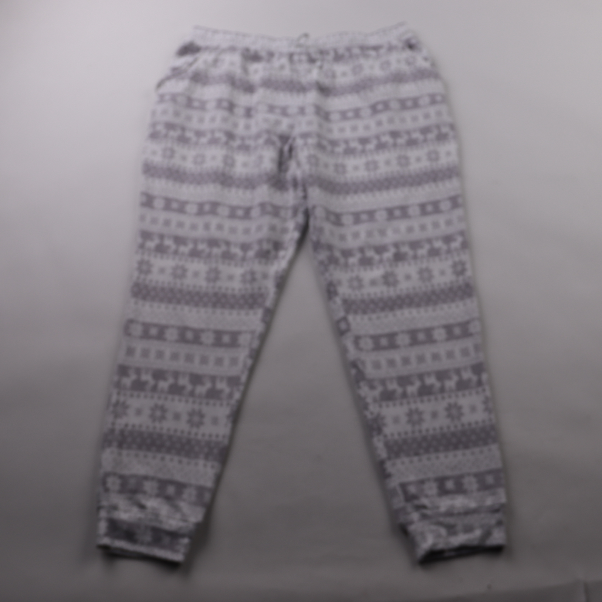 Брюки F&F из мягкого трикотажа с серо-белым зимним орнаментом и поясом на резинке со шнурком. Удобны для дома и отдыха, хорошо сочетаются с базовыми худи и футболками. Практичный плюс — эластичный материал не сковывает движения и легко стирается.