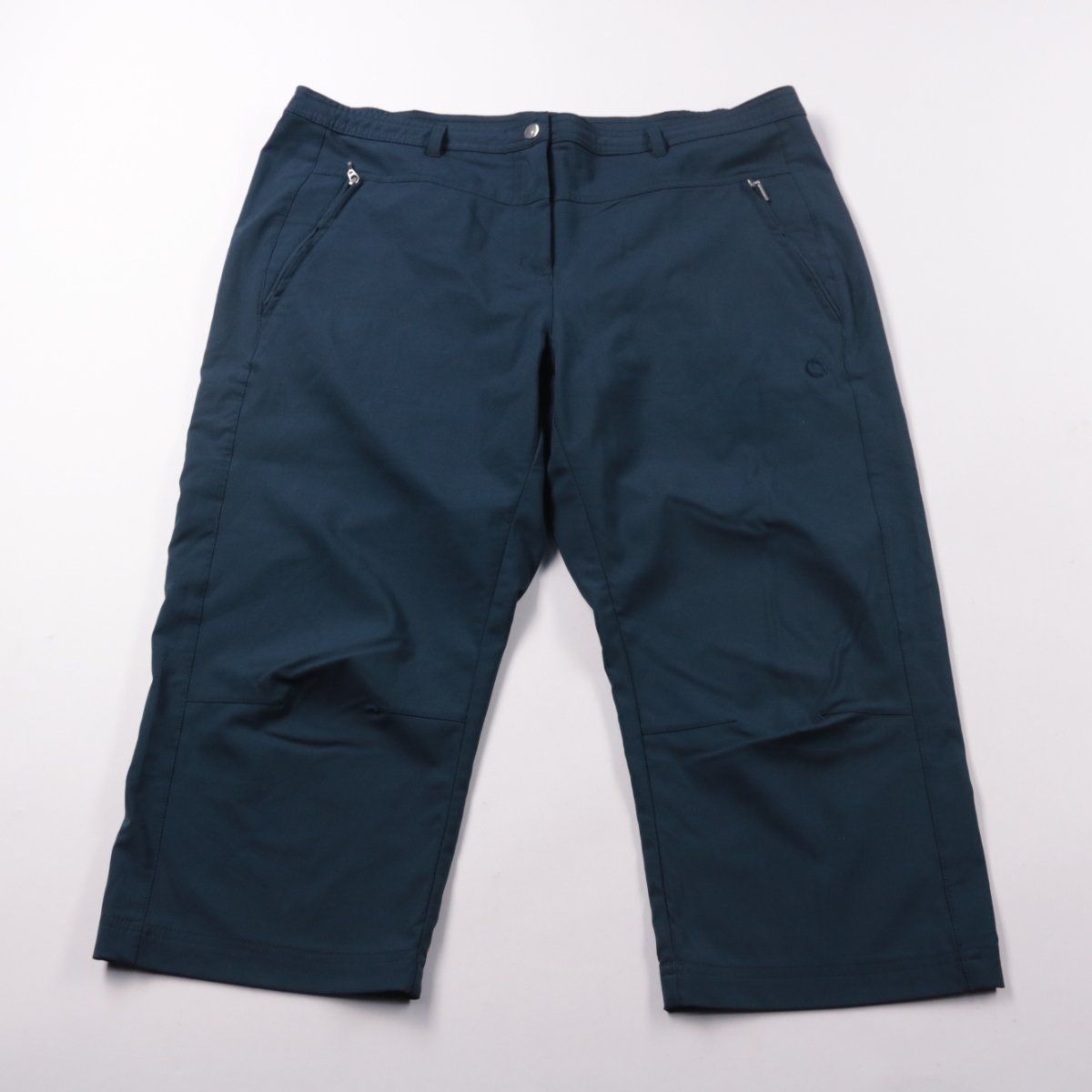 Женские брюки Unea Primero тёмно-синего цвета, укороченной длины и с карманами на молниях. Подойдут для повседневной носки в городе и поездок в прохладную погоду. Практичный материал со стрейчем хорошо держит форму и не сковывает движения.