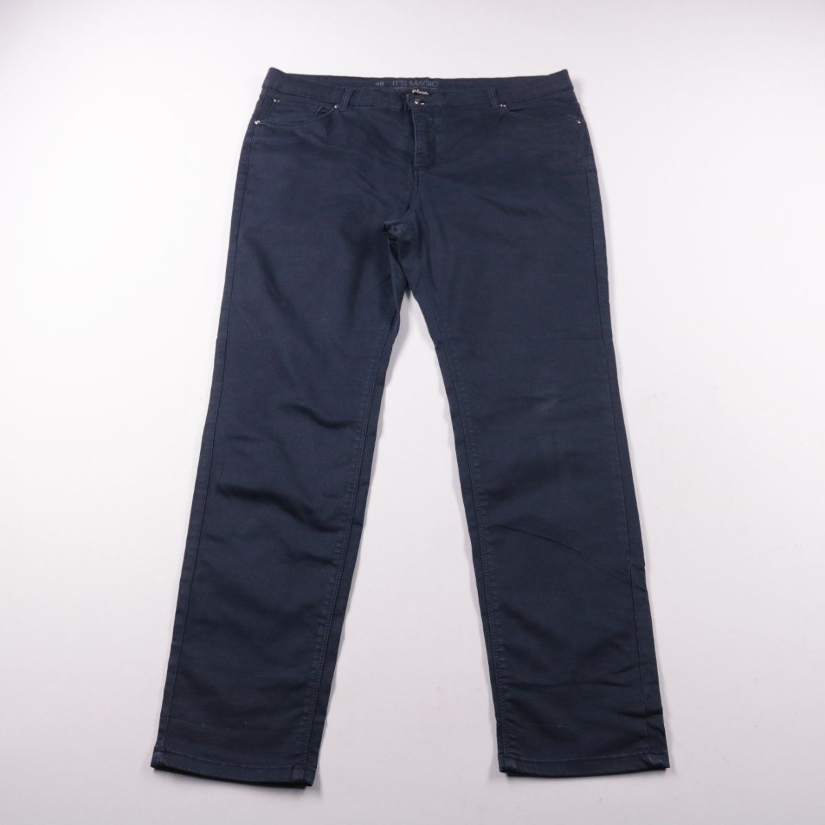 Женские прямые брюки It's Magic тёмно-синего цвета из хлопковой ткани со стрейчем. Подойдут для повседневной носки и офиса, хорошо сочетаются с рубашками и свитерами. Материал эластичный и комфортно садится по фигуре.