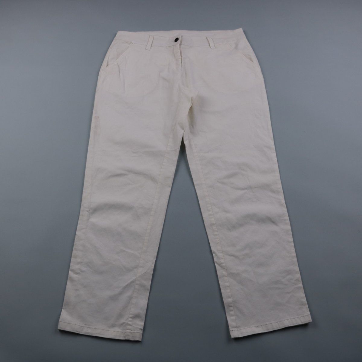 Женские прямые брюки базового кроя в светлом (белом) цвете. Подойдут для повседневных комплектов и офиса в тёплое время года, хорошо сочетаются с рубашками и футболками. Плотный хлопок с добавлением эластана даёт комфортную посадку и лёгкую растяжимость.