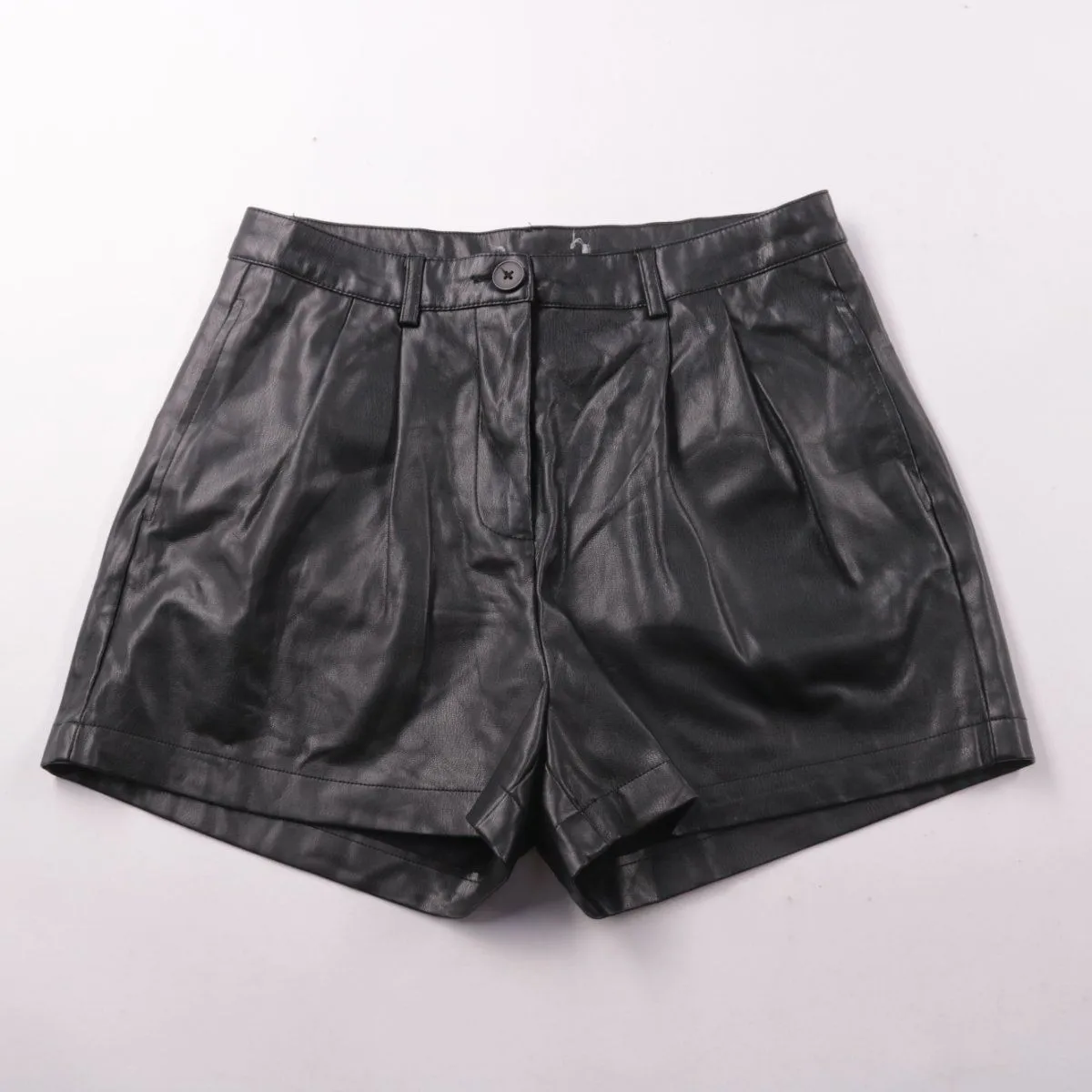 Шорты Primark из экокожи чёрного цвета с высокой посадкой и складками спереди. Подойдут для летних прогулок и образов в стиле casual. Материал практичный — поверхность легко протирать и очищать.