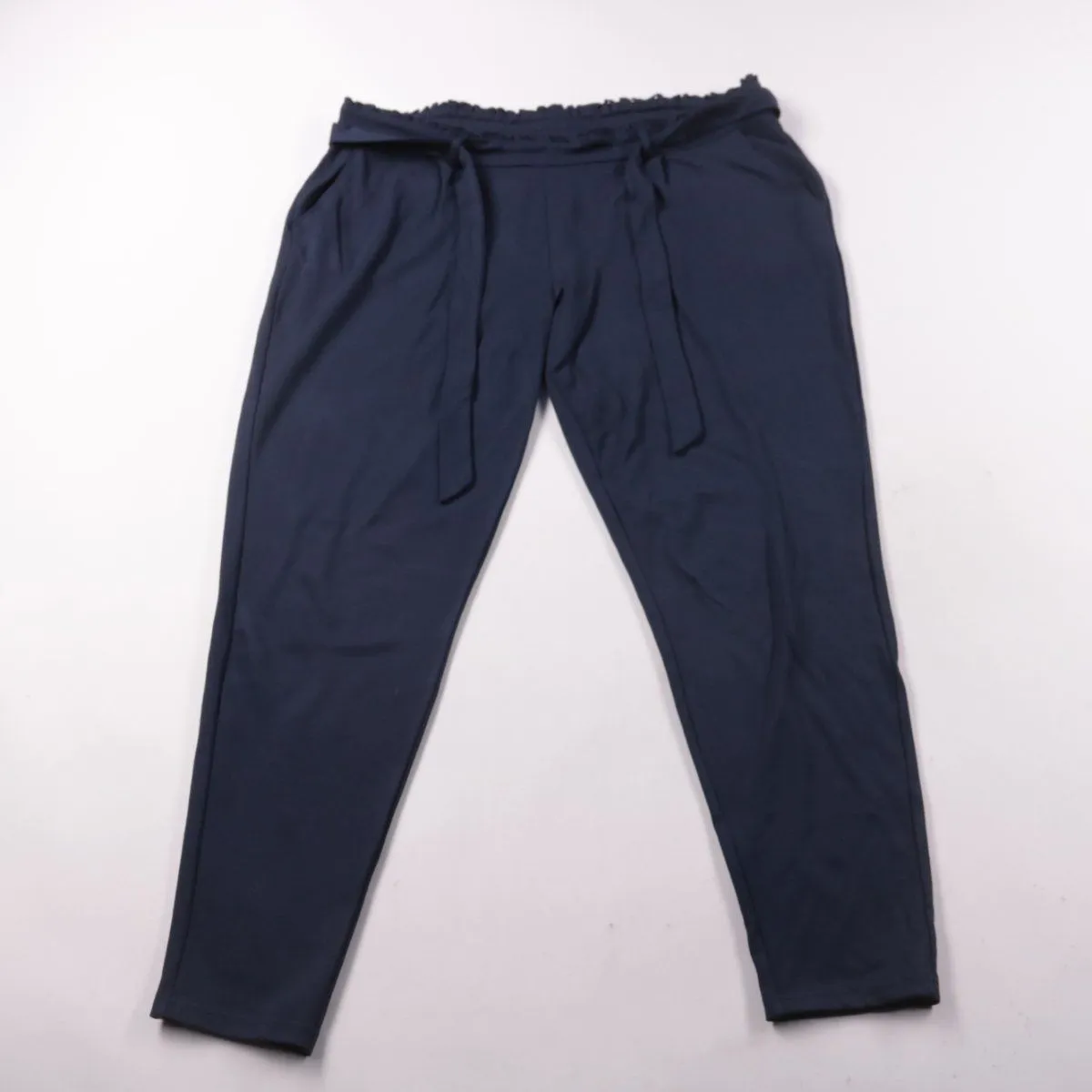 Женские брюки Gina тёмно-синего цвета с эластичным поясом и завязками. Подойдут для повседневной носки и офиса благодаря лаконичному зауженному крою. Эластичная ткань хорошо тянется и комфортно садится по фигуре.