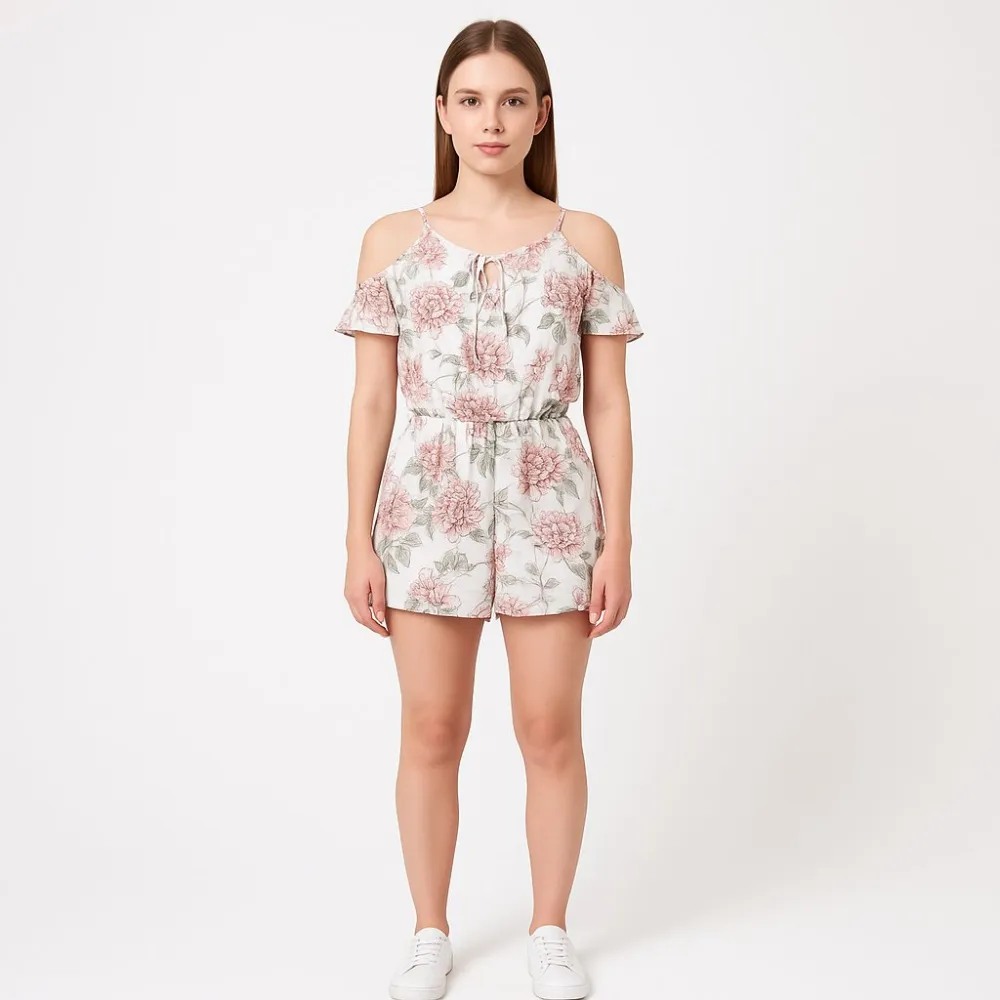Летний комбинезон Amisu с цветочным принтом и открытыми плечами. Подойдёт для прогулок и отпускных образов, лёгкий материал комфортно носится в жару. Талия на резинке, поэтому посадка хорошо подстраивается по фигуре.