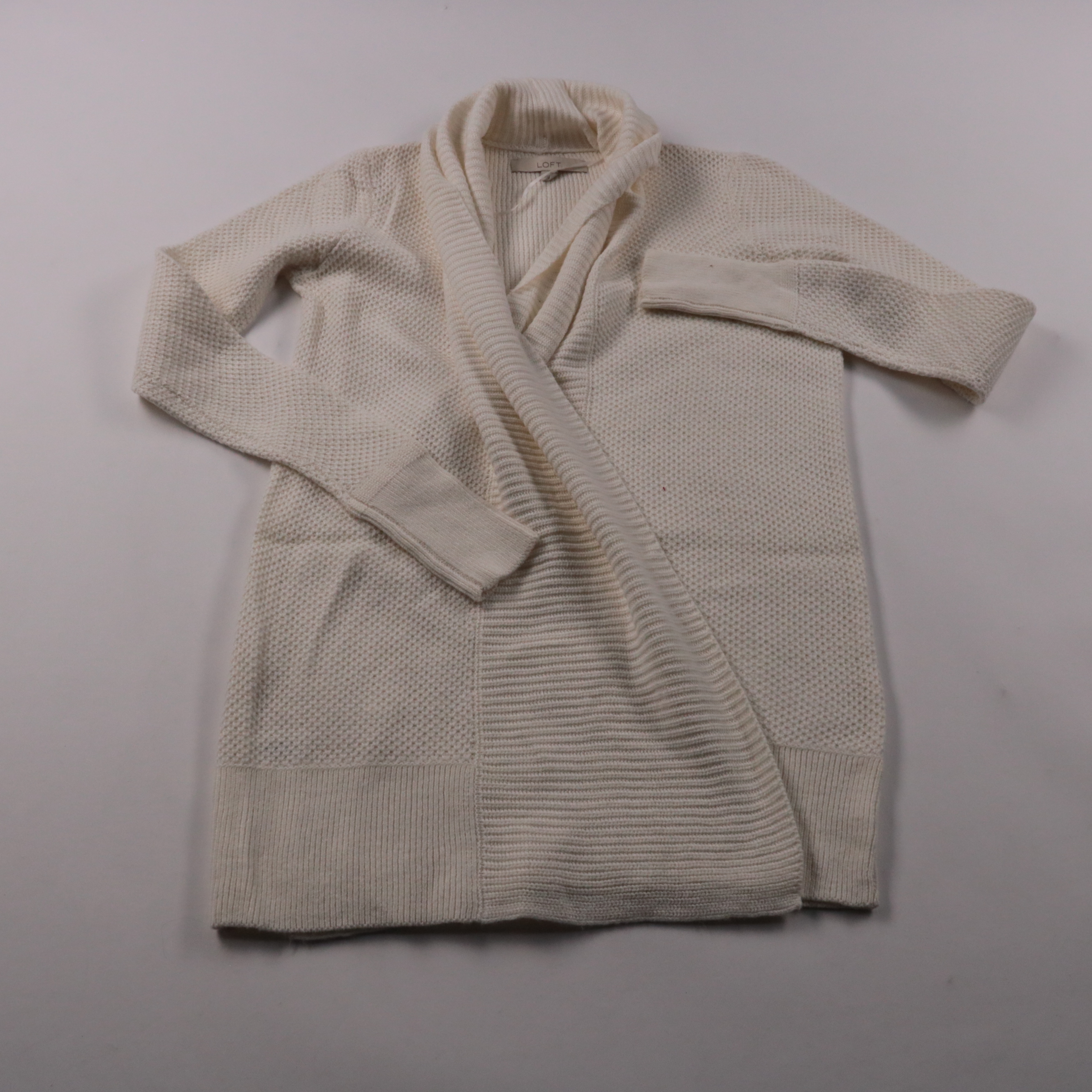 Вязаный кардиган Loft молочного цвета с запахом и объёмным воротником-шалькой. Подойдёт для повседневных образов в прохладную погоду, хорошо сочетается с джинсами и платьями. Практичный вариант для многослойности — легко накинуть поверх топа или водола...