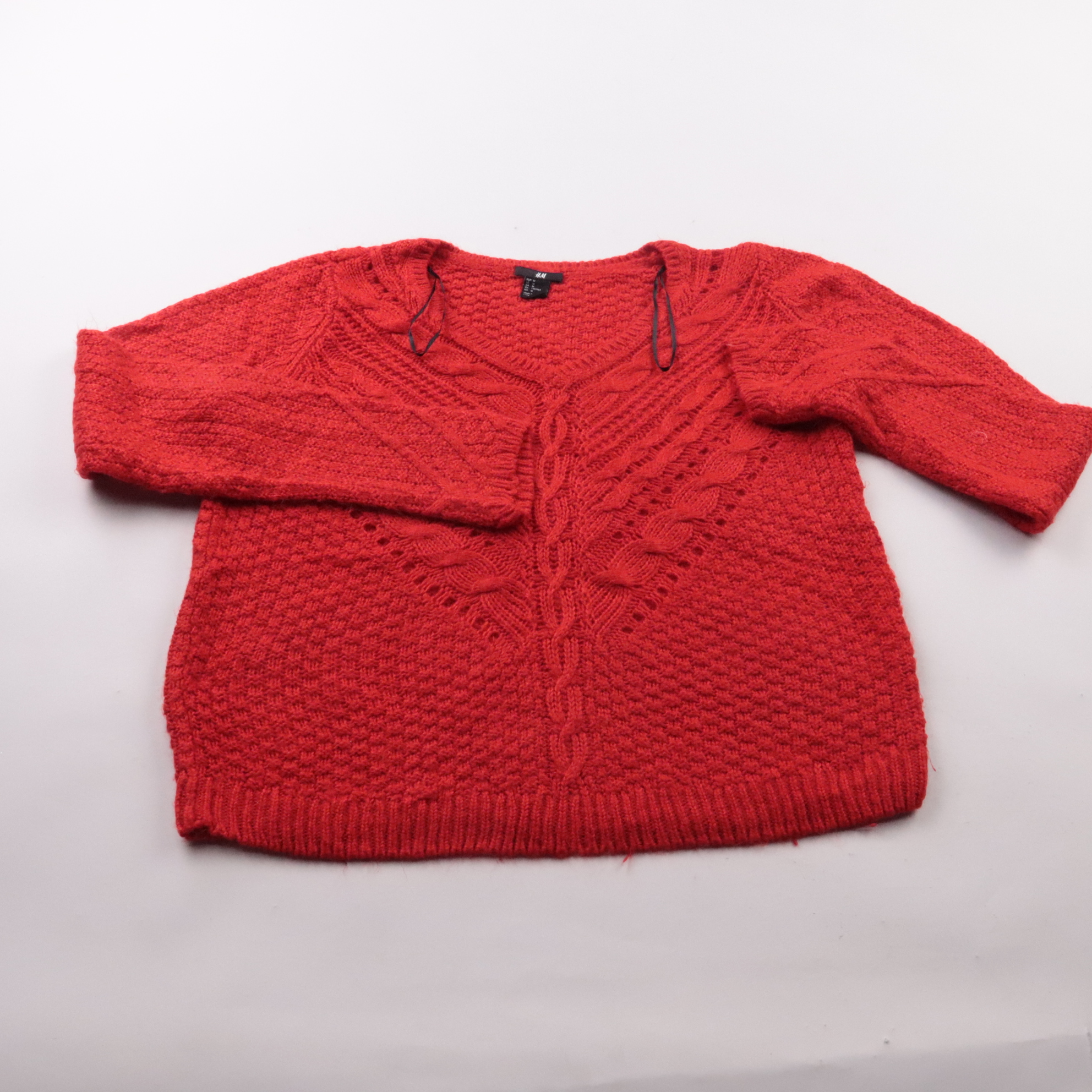 Вязаный джемпер H&M красного цвета с фактурной вязкой и V-образным вырезом. Подойдёт для прохладной погоды и многослойных образов с рубашкой или топом. Акриловый состав делает вещь лёгкой в уходе и быстро сохнущей.