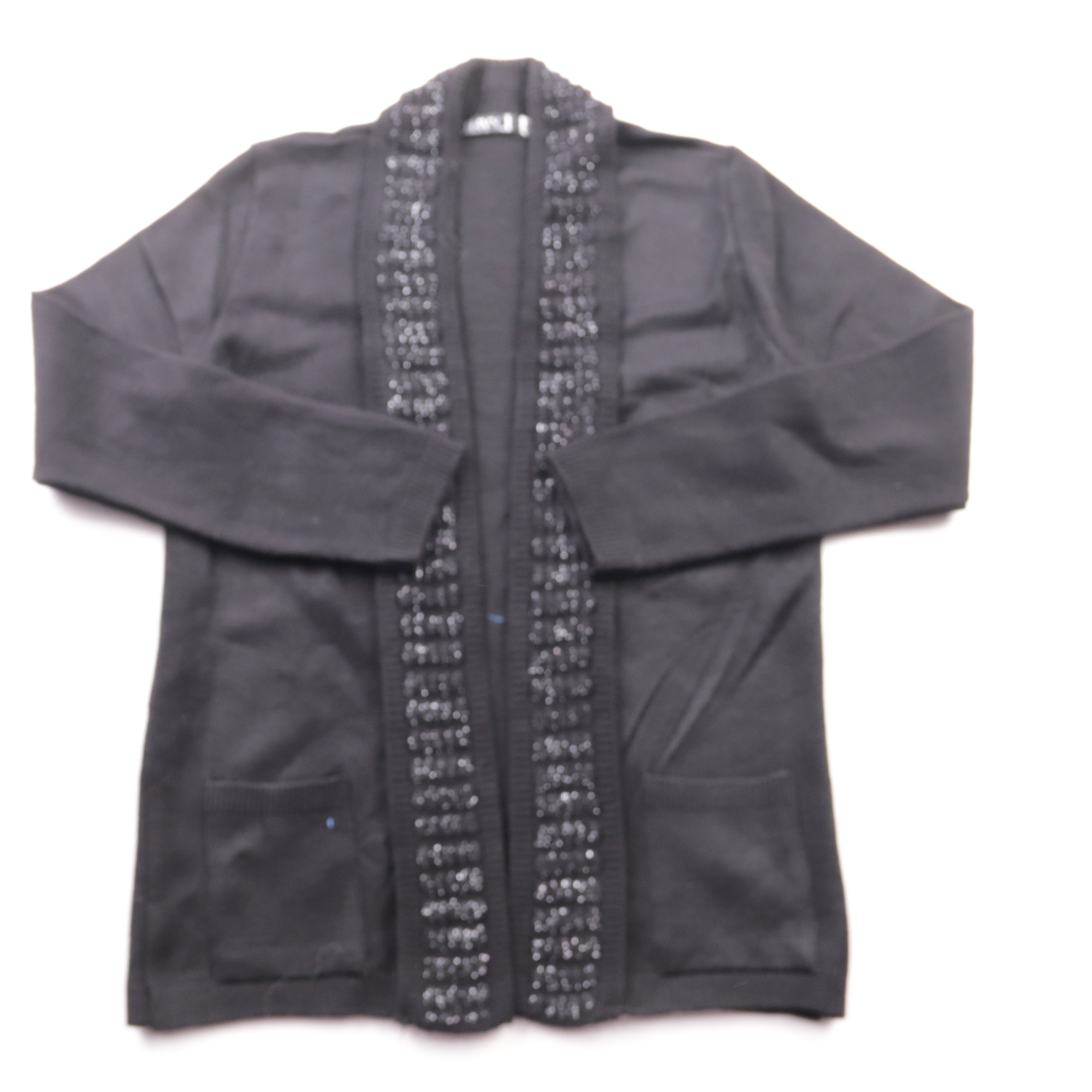 Кардиган Envy чёрного цвета с декоративной отделкой по планке и двумя накладными карманами. Подойдёт для офиса и вечерних выходов — легко надеть поверх топа или платья. Плотная трикотажная ткань держит форму и немного тянется за счёт эластана.