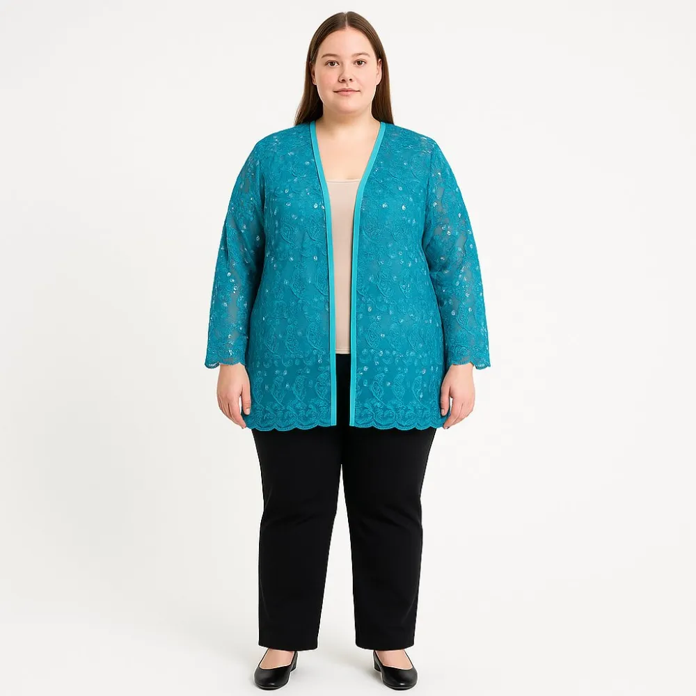 Женский кардиган из кружевной сетки бирюзового цвета, без застёжки, с V-образным вырезом. Подойдёт для офиса, торжества или летних вечеров поверх топа/платья, добавляя образу фактуру и лёгкий блеск вышивки. Лёгкий и компактный — удобно брать с собой и ...