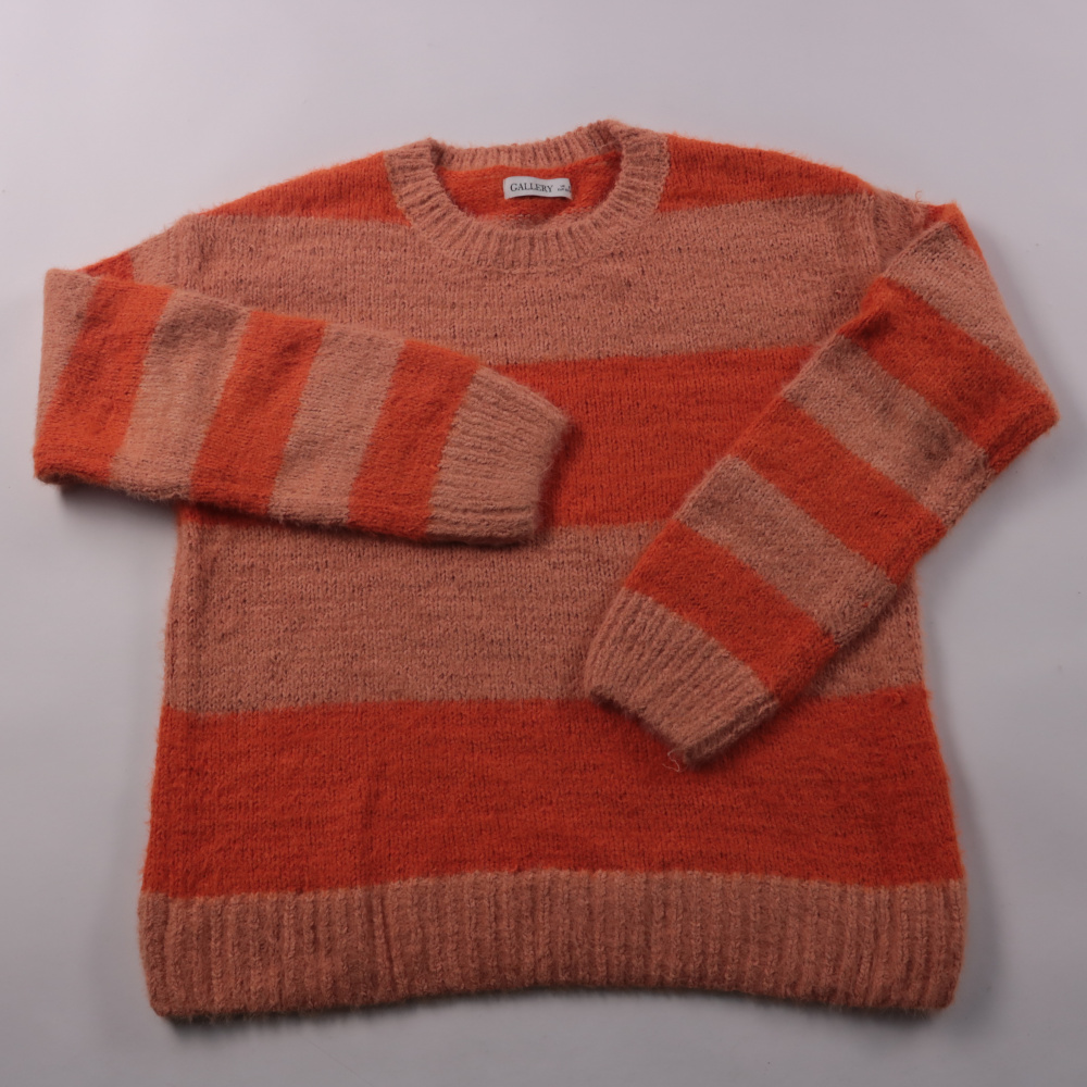 Вязаный джемпер Gallery в оранжево-бежевую полоску с круглым вырезом и мягкой фактурой. Подойдёт для повседневных образов в прохладную погоду, хорошо смотрится с джинсами и базовыми брюками. Практичен в уходе и комфортно тянется за счёт синтетического ...