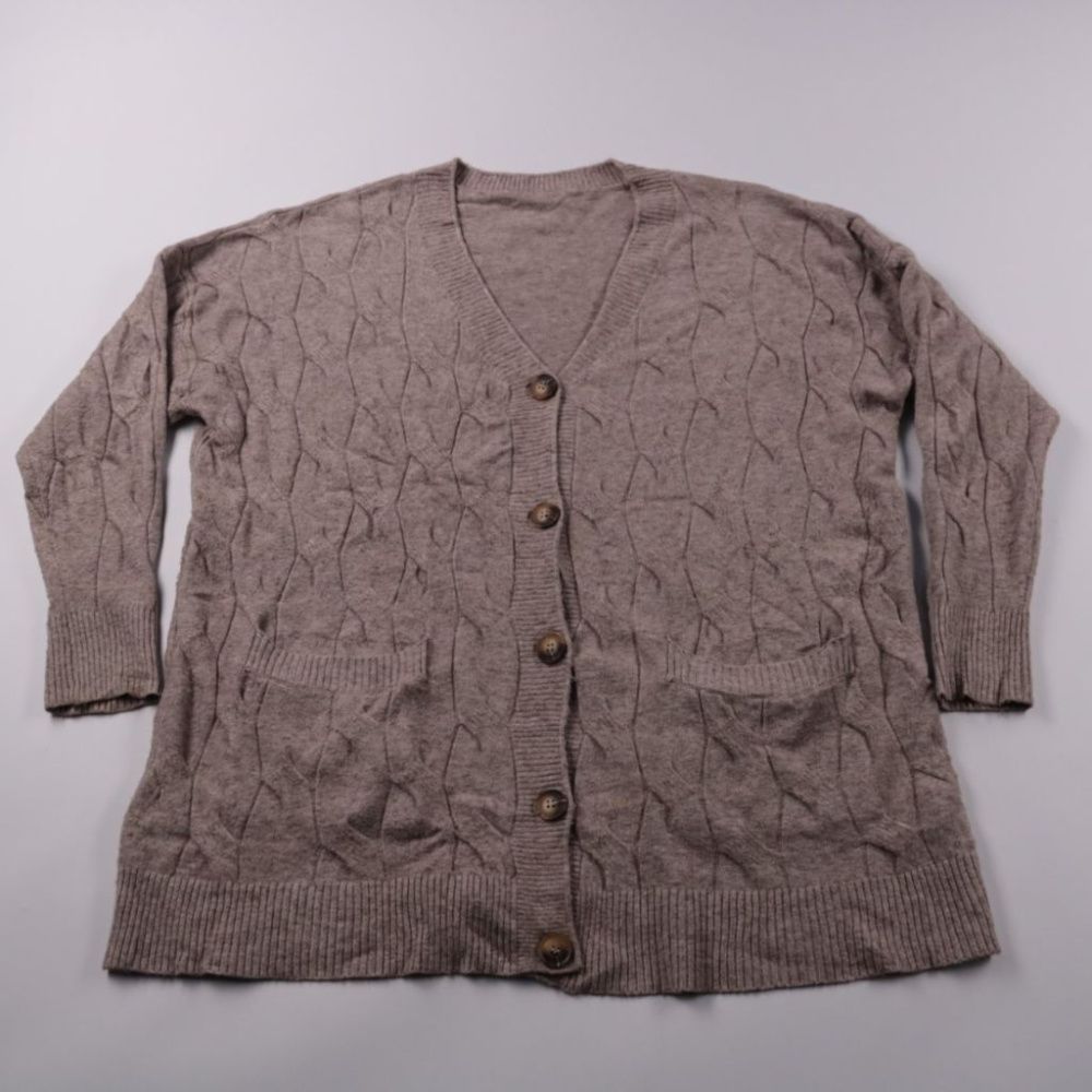 Женский кардиган на пуговицах с V‑образным вырезом и фактурной вязкой, бренд на бирке не указан. Подойдёт для офиса и повседневных образов, удобно носить как второй слой поверх топа или блузы. Практичный состав (вискоза/полиамид/нейлон/модал) хорошо де...