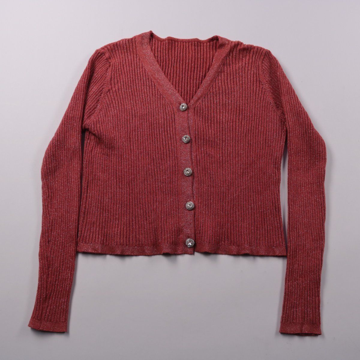Вязаный кардиган Tattoo бордового цвета в рубчик, на пуговицах и с V‑образным вырезом. Подойдёт для повседневных образов в прохладную погоду, хорошо сочетается с джинсами и юбками. Трикотаж с люрексом слегка мерцает и комфортно садится по фигуре.