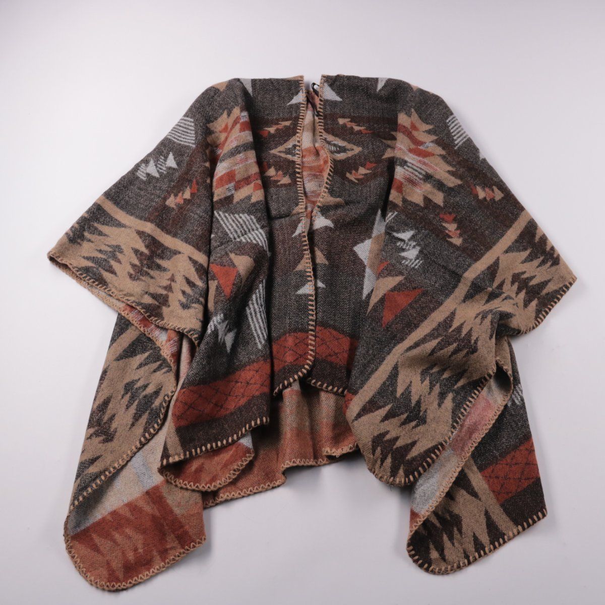 Плед с геометрическим этно-узором в тёплых коричнево-бежевых оттенках. Подойдёт для дивана или кресла, чтобы укрыться дома или на веранде. Края аккуратно обработаны, плед удобно складывается и хранится.