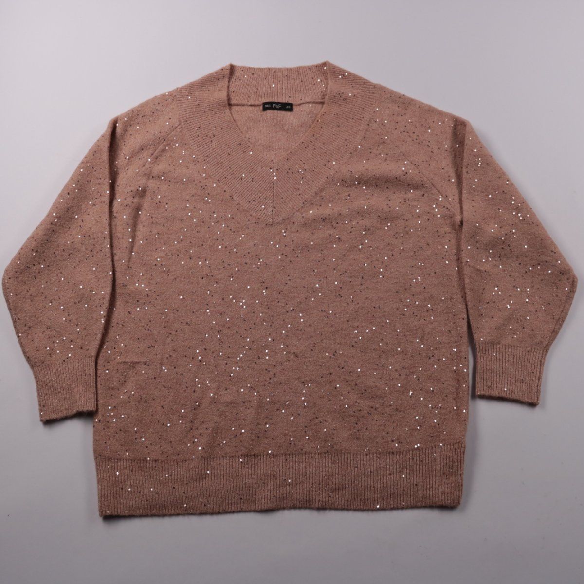 Женский джемпер F&F пудрово-розового оттенка с V-образным вырезом и деликатным блеском по всей поверхности. Подойдёт для повседневных образов и выходов, легко сочетается с джинсами или юбкой. Практичный плюс — мягкий трикотаж и эластичные манжеты/низ хорошо держат форму.