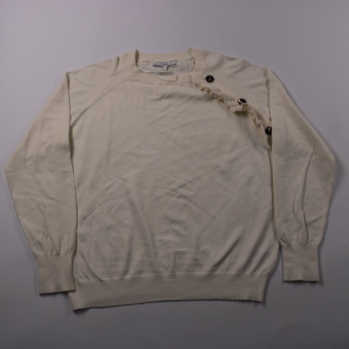 Джемпер Next молочного цвета с декоративной планкой на пуговицах у плеча. Подойдёт для повседневных образов и офиса, хорошо сочетается с джинсами и юбками. Мягкий трикотаж и манжеты/низ в рубчик помогают держать форму и комфортно сидеть.
