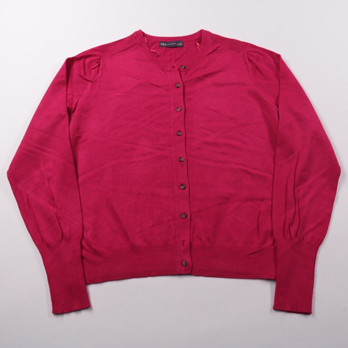 Кардиган M&S Collection ягодно-розового цвета на пуговицах, с лёгкими сборками на плечах. Подойдёт для офиса и повседневных образов в прохладную погоду, удобно носить как второй слой поверх топа или платья. Тонкий трикотаж на основе вискозы мягко ощущается и не занимает много места в сумке.