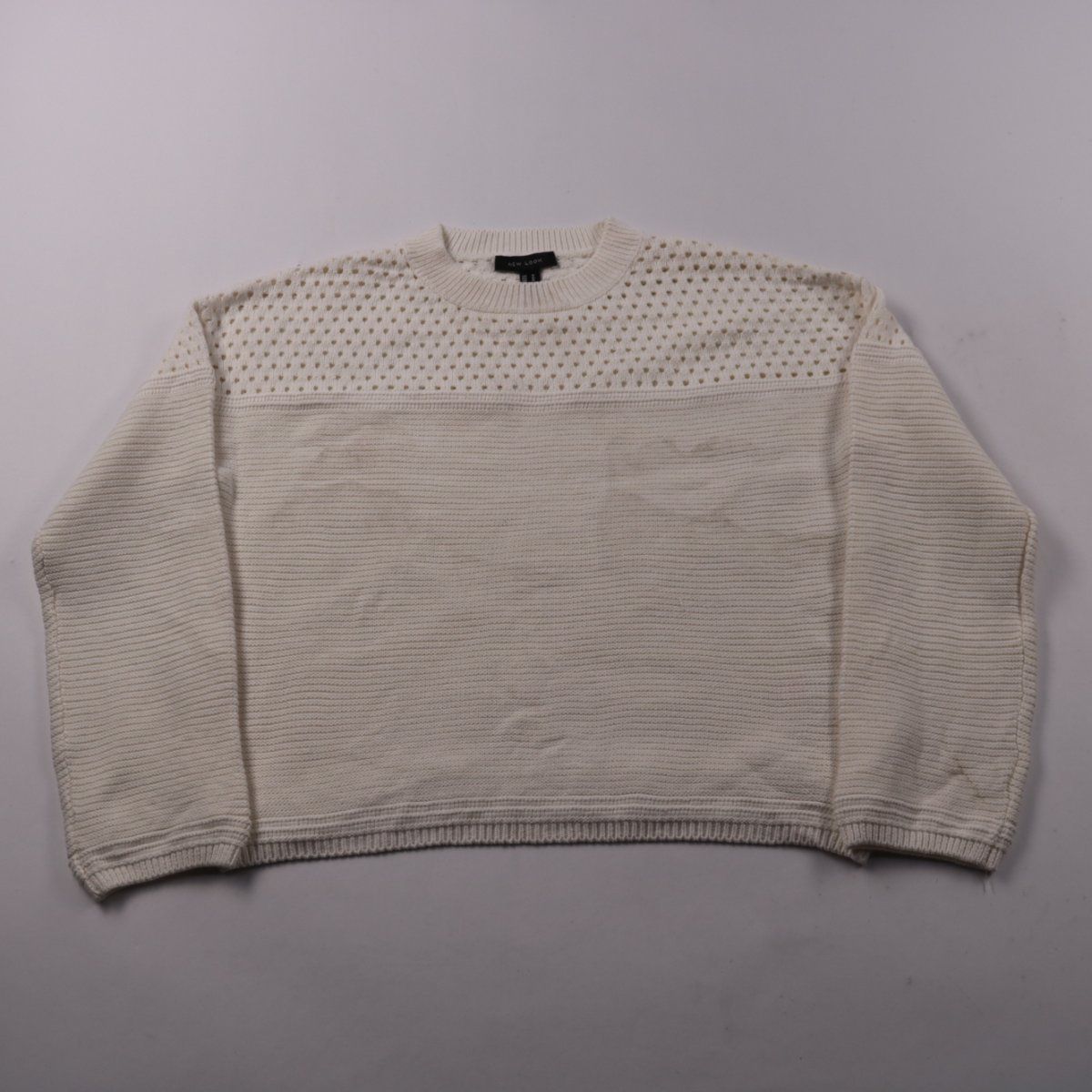 Вязаный джемпер New Look молочного оттенка с круглым вырезом и фактурной ажурной вставкой по линии груди. Подойдёт для повседневных образов в прохладную погоду, хорошо смотрится с джинсами и юбками. Смесовый состав с хлопком комфортен к телу и проще в уходе, чем чистая шерсть.