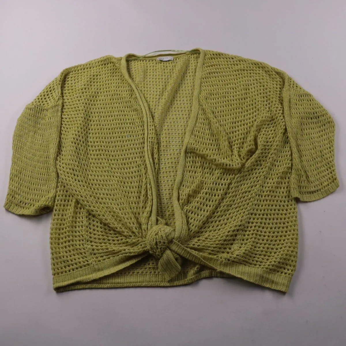 Женский ажурный кардиган Papaya свободного кроя с коротким рукавом и завязкой спереди. Подойдёт для летних образов и как лёгкая накидка на топ или платье. Пористая вязка хорошо пропускает воздух и почти не мнётся.
