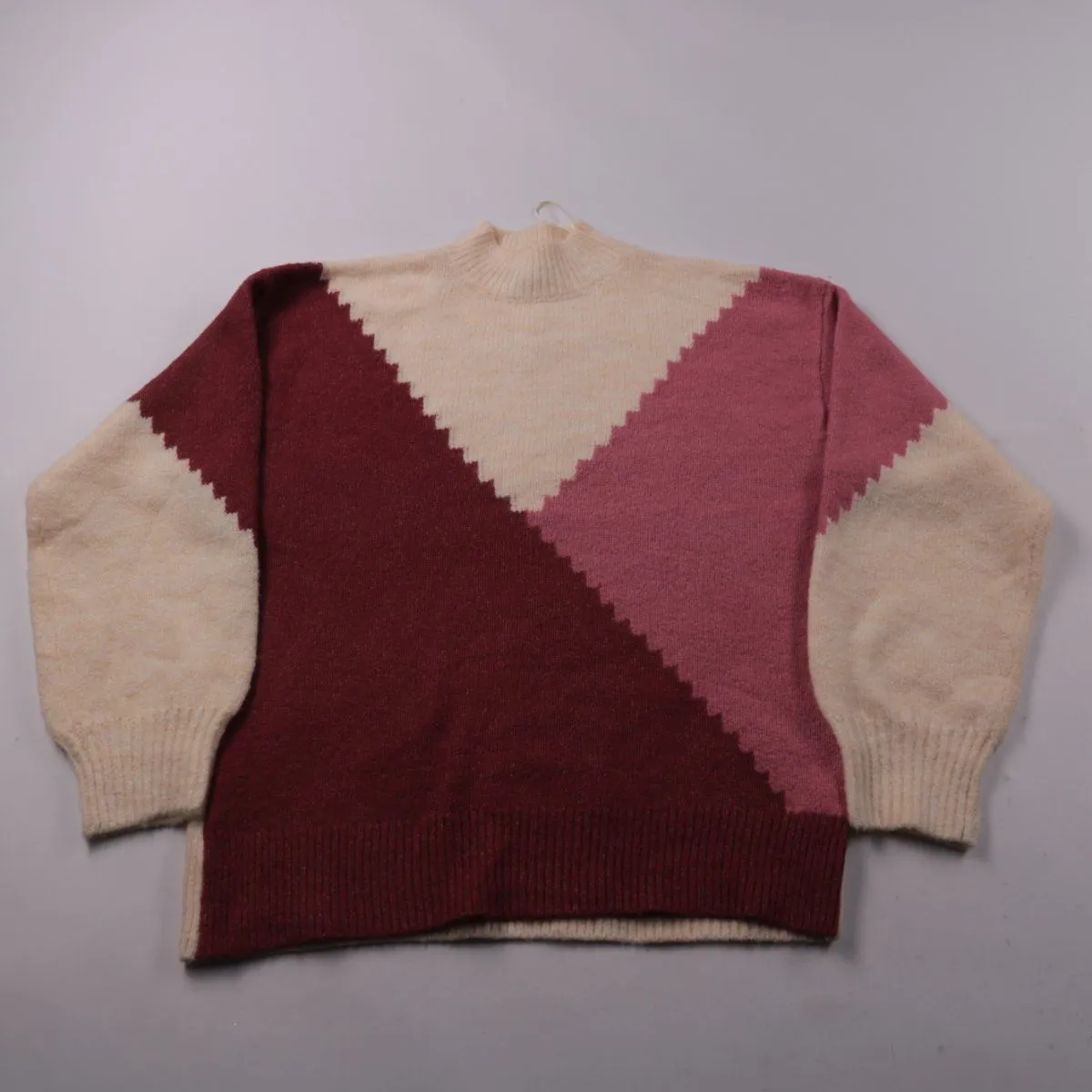 Вязаный свитер New Look с геометрическим узором колор-блок в бежевом, бордовом и розовом оттенках и воротником-стойкой. Подойдёт для повседневных образов в прохладную погоду, хорошо сочетается с джинсами и однотонными брюками. Практичен в носке за счёт мягкого синтетического состава и простого ухода.