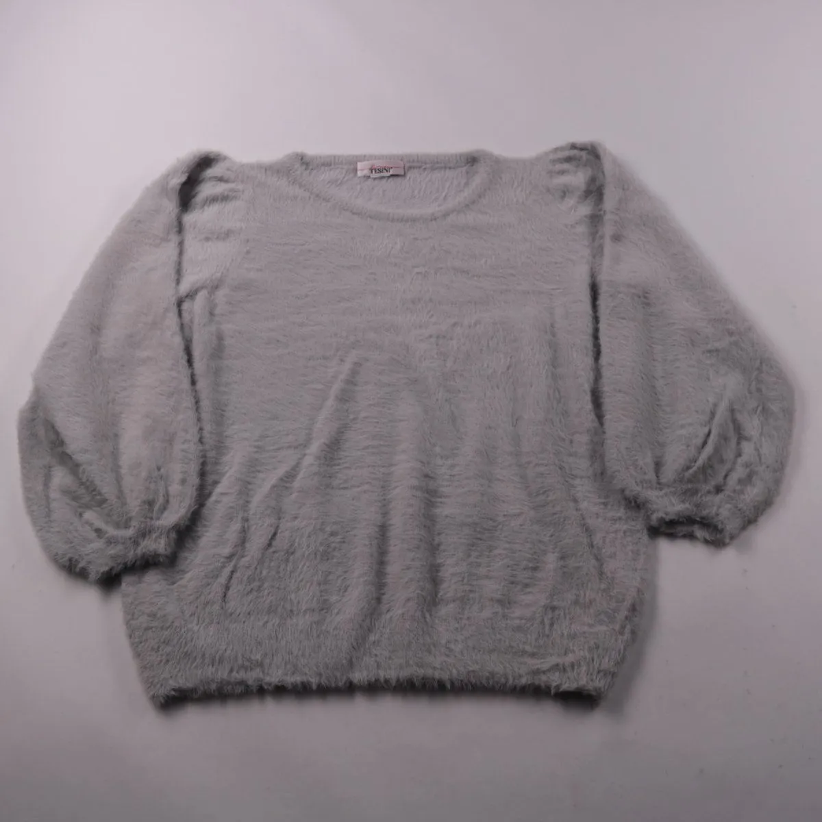 Пушистый свитер Tesini серого цвета с круглым вырезом и объёмными рукавами. Подойдёт для повседневных образов в прохладную погоду. Мягкий материал приятен к телу и хорошо удерживает тепло.