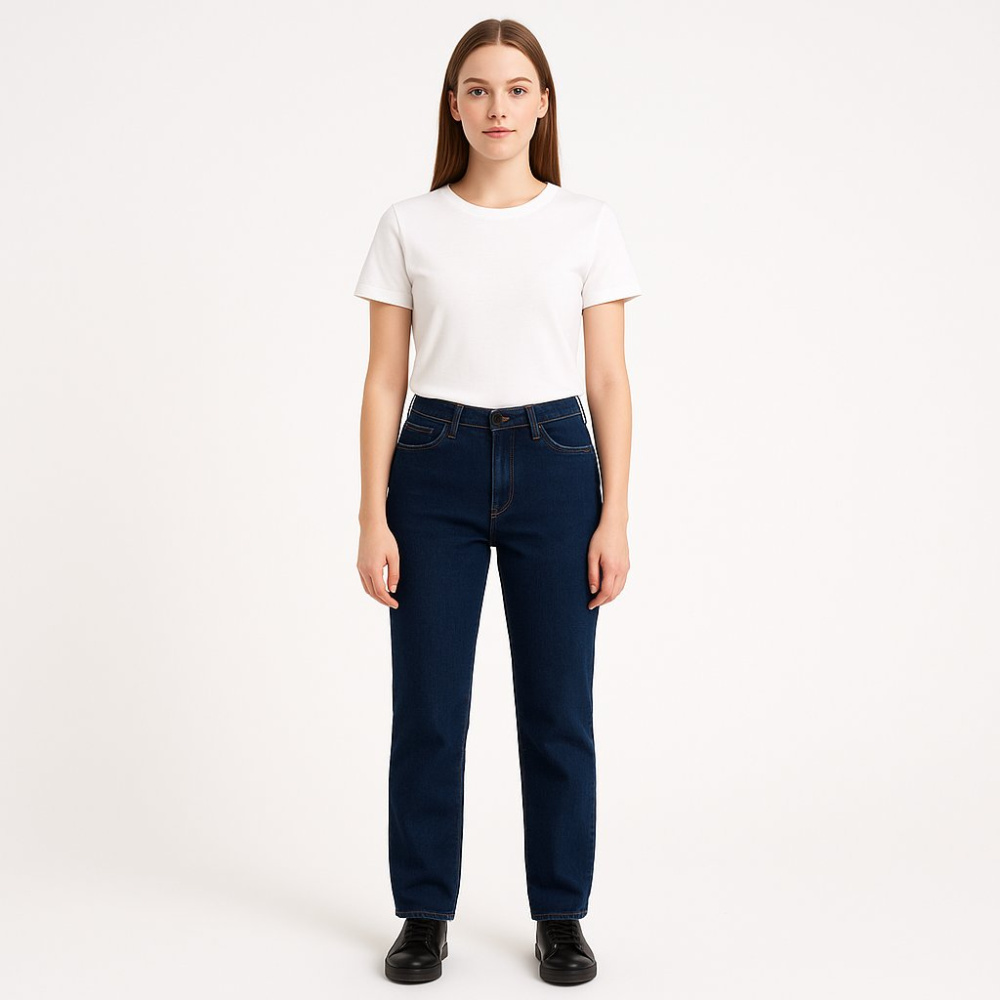 Женские джинсы прямого кроя из тёмно-синего денима. Подойдут на каждый день и в офисный casual с футболкой, рубашкой или жакетом. Плотная ткань хорошо держит форму и долго носится.