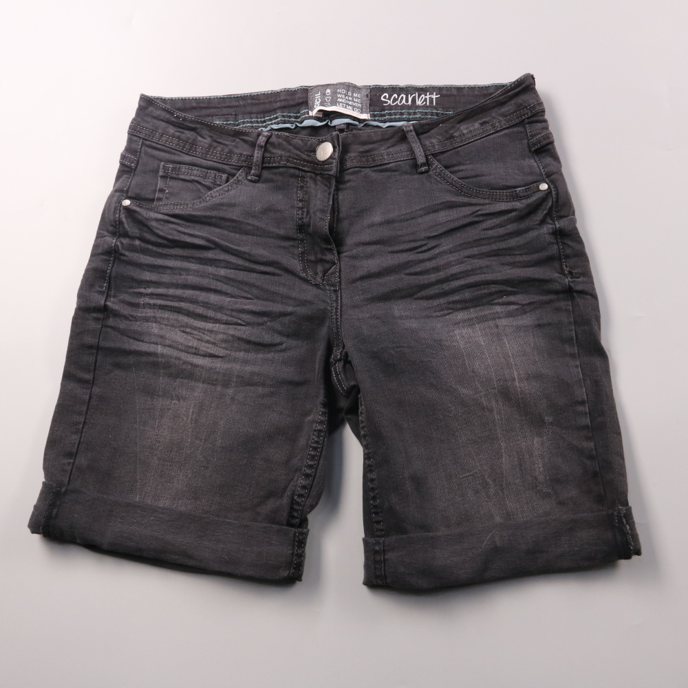 Женские джинсы-шорты Cecil (модель Scarlett) из тёмно-серого денима с лёгким эффектом варки и подворотами. Подойдут для повседневных летних образов с футболкой или рубашкой. Ткань с добавлением эластана комфортно тянется и хорошо садится по фигуре.