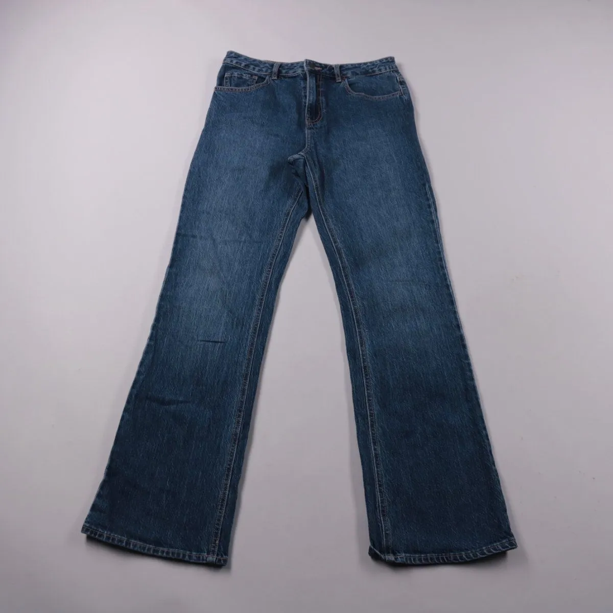 Женские джинсы STR из синего денима с лёгким клёшем и классической посадкой на молнии. Подойдут для повседневных образов в любое время года и хорошо сочетаются с кедами или ботинками. Ткань с небольшим добавлением эластана комфортнее в движении.