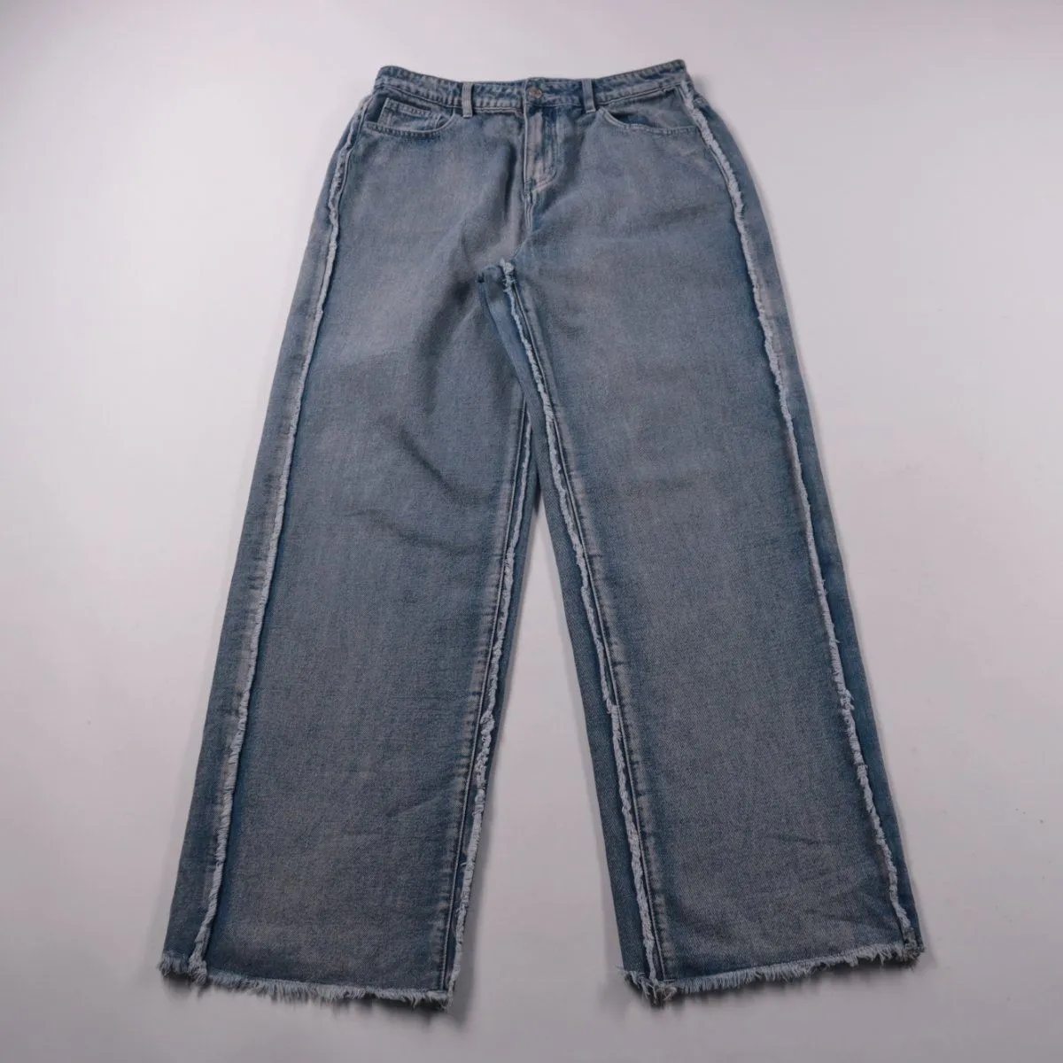 Женские джинсы SHEIN из синего денима, широкие по ноге, с декоративными необработанными швами по бокам и бахромой по низу. Подойдут для повседневных и streetwear-образов в любое время года. Плотная ткань хорошо держит форму.