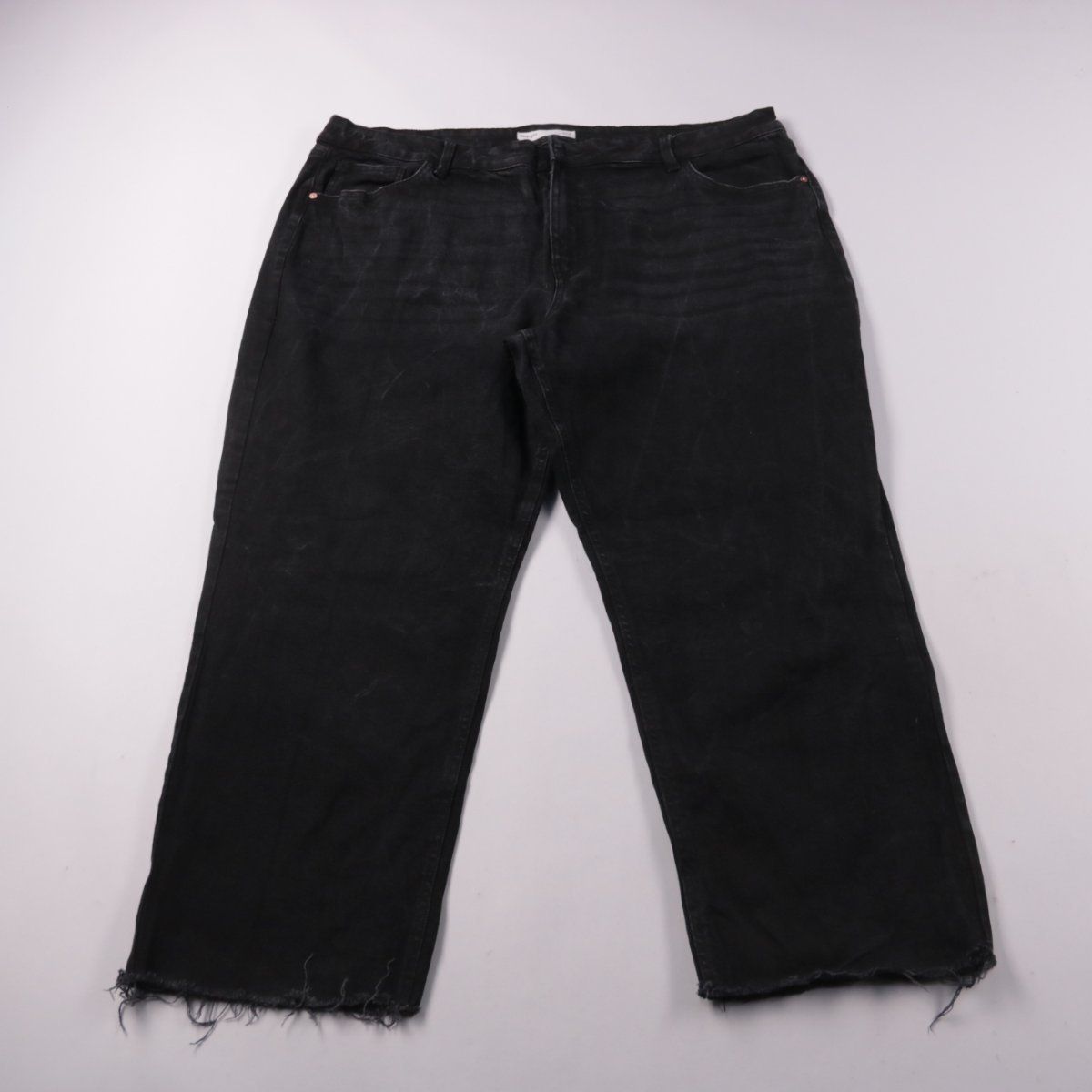 Женские чёрные джинсы прямого кроя, низ с необработанным (рваным) краем. Подойдут для повседневных образов и на прохладную погоду в межсезонье. Плотный деним хорошо держит форму и сочетается с базовым гардеробом.