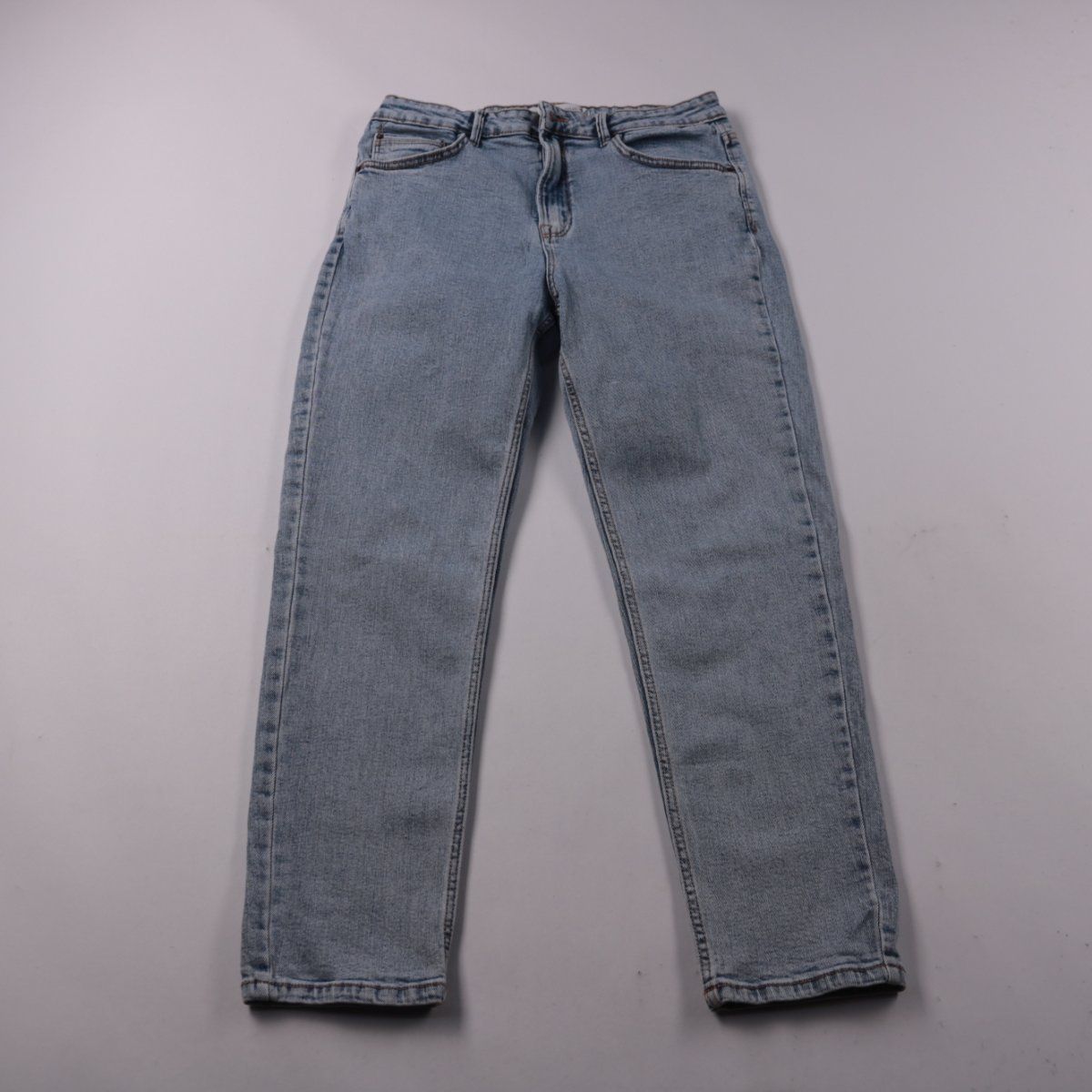 Женские джинсы Stradivarius светло-синего денима с классической посадкой и пятью карманами. Подойдут для повседневных образов в городе и на прогулки. Прочный материал хорошо держит форму и удобен в носке.