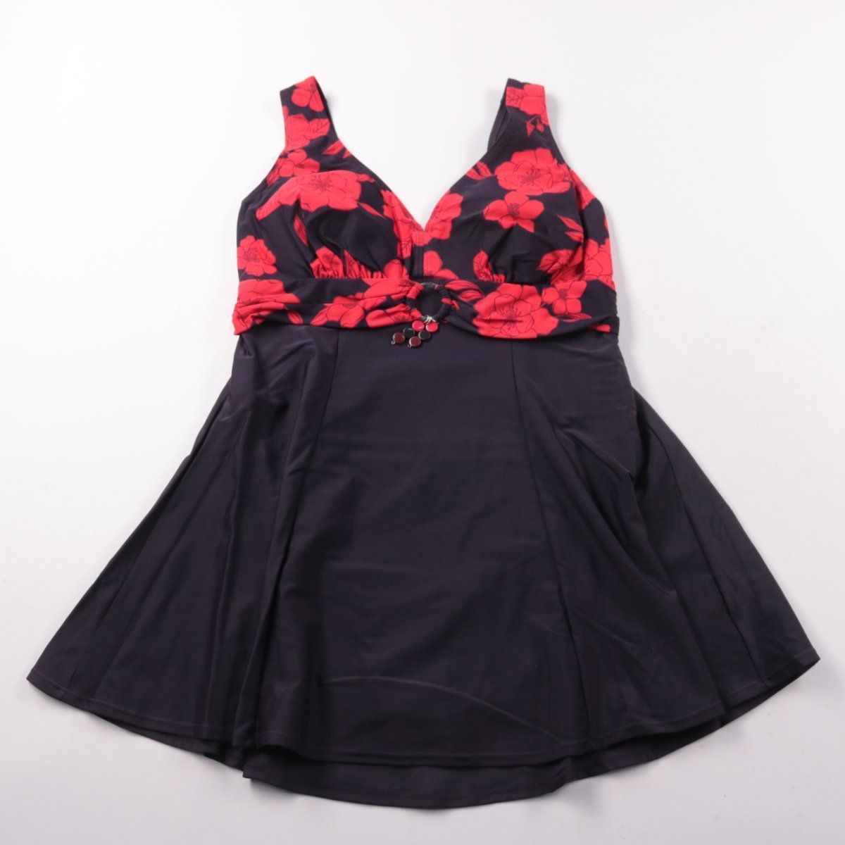 Женский купальник-платье Ulla Popken чёрного цвета с красным цветочным принтом и чашками на широких бретелях. Подойдёт для пляжа и бассейна, а завышенная линия под грудью и расклешённая юбка мягко маскируют область живота. Быстросохнущий эластичный материал хорошо держит форму в воде.