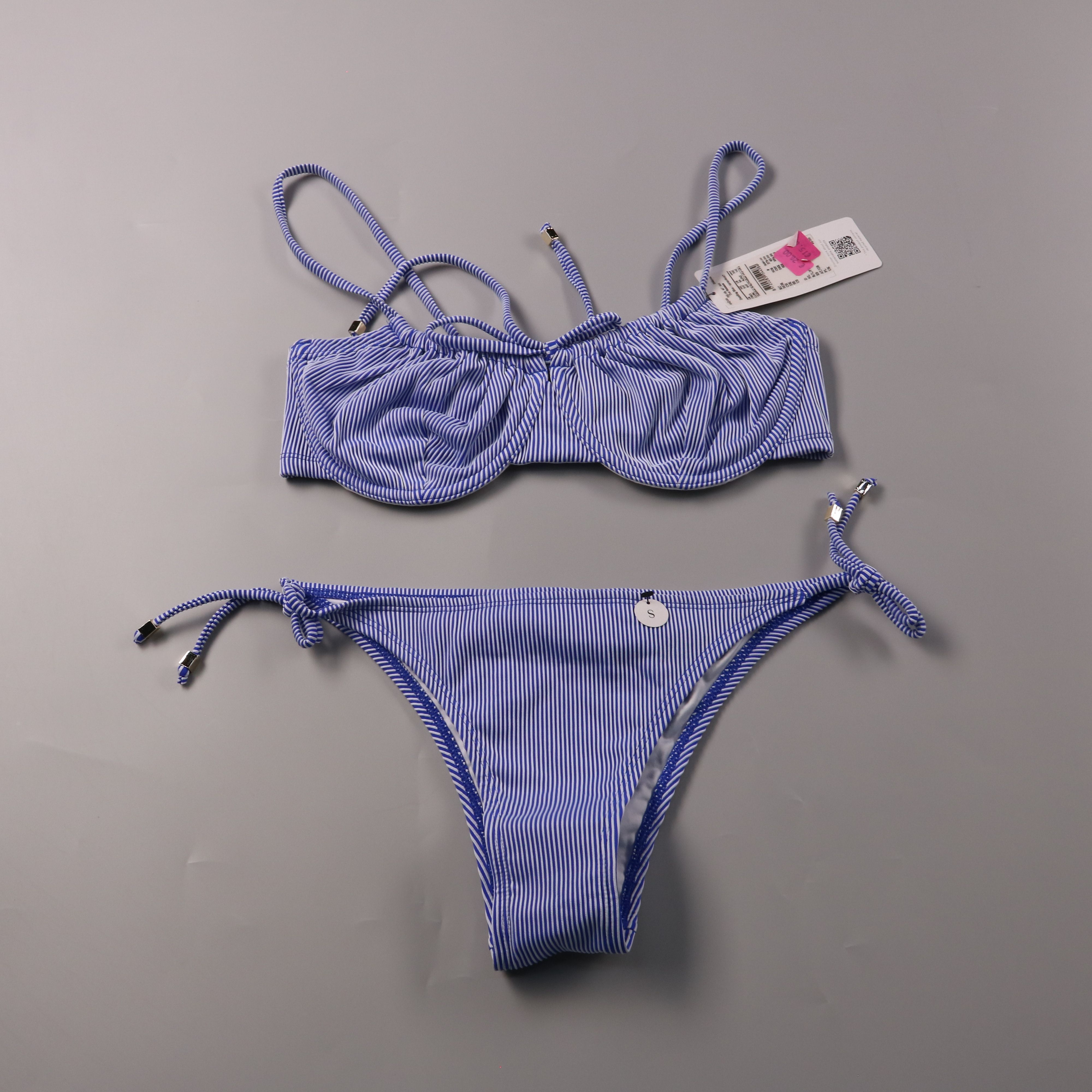 Женский раздельный купальник в сине-белую полоску (Dazzling Blue): топ с формованными чашками на косточках и трусики бикини на завязках по бокам. Подойдёт для пляжа и бассейна, завязки позволяют точнее отрегулировать посадку. Материал эластичный, с под...
