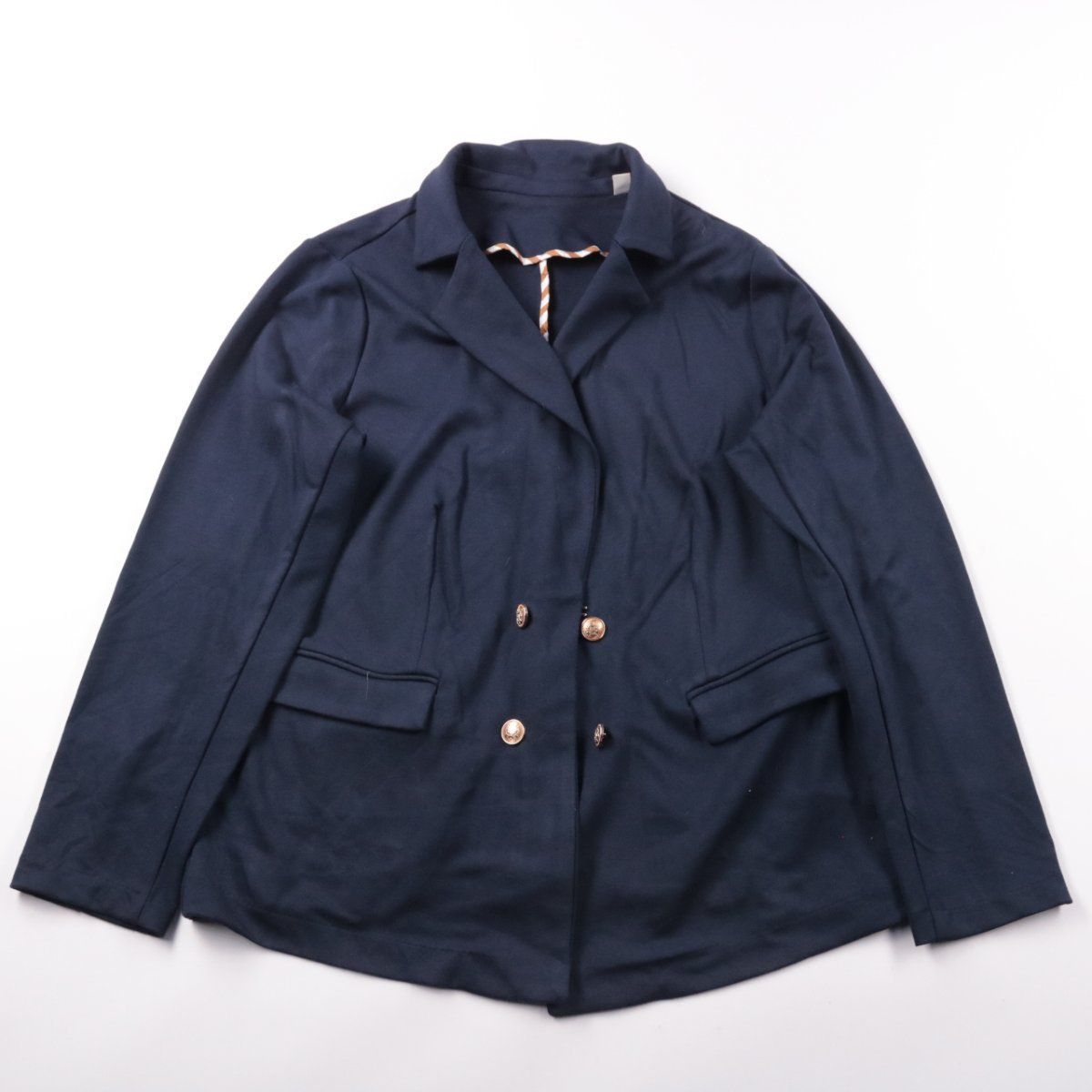 Женский пиджак тёмно-синего цвета с двубортной застёжкой на пуговицы и классическими клапанными карманами. Подойдёт для офиса и повседневных образов, легко сочетается с брюками, юбкой или джинсами. Практичный вариант: держит форму и добавляет образу аккуратную структуру.