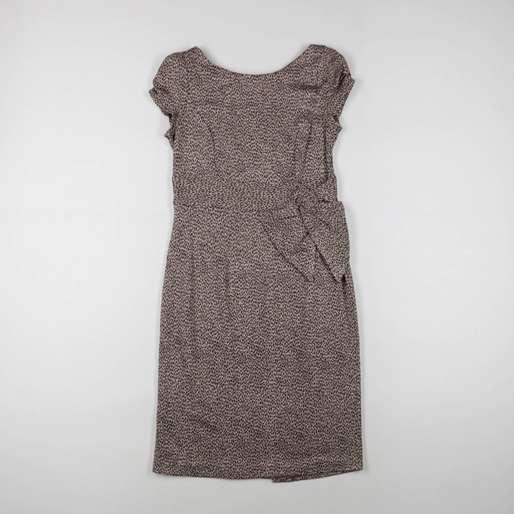 Женское повседневное платье с мелким анималистичным принтом и короткими рукавами, на талии широкий пояс с бантом сбоку. Подойдёт для офиса и прогулок в тёплую погоду, легко сочетается с однотонными аксессуарами. Пояс подчёркивает талию и помогает регул...