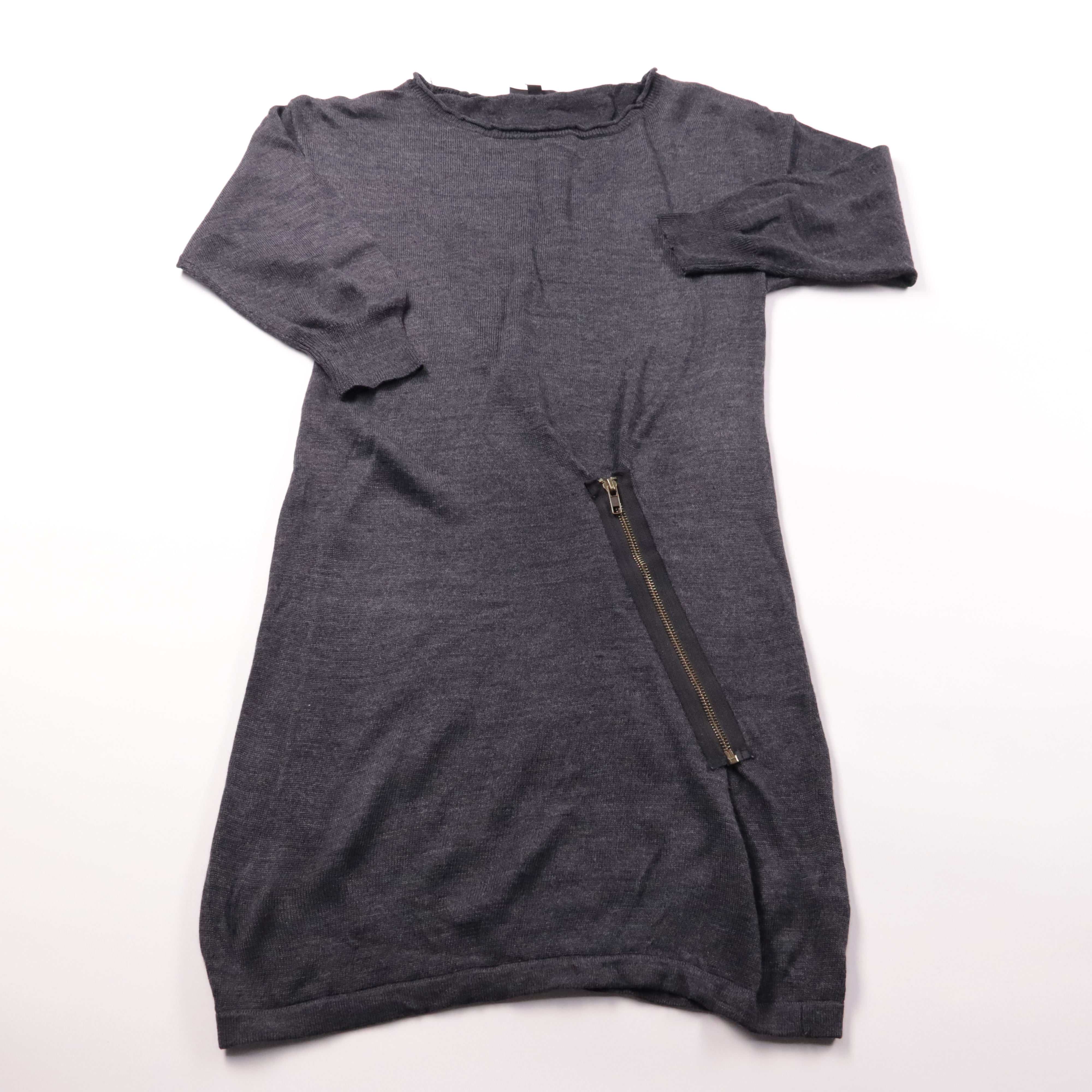 Трикотажное платье Topshop графитового цвета с рукавом 3/4 и декоративной молнией сбоку. Подойдёт для повседневных образов в прохладную погоду, легко сочетается с кедами или ботильонами. Практичный плюс — мягкий тонкий трикотаж и простой уход.